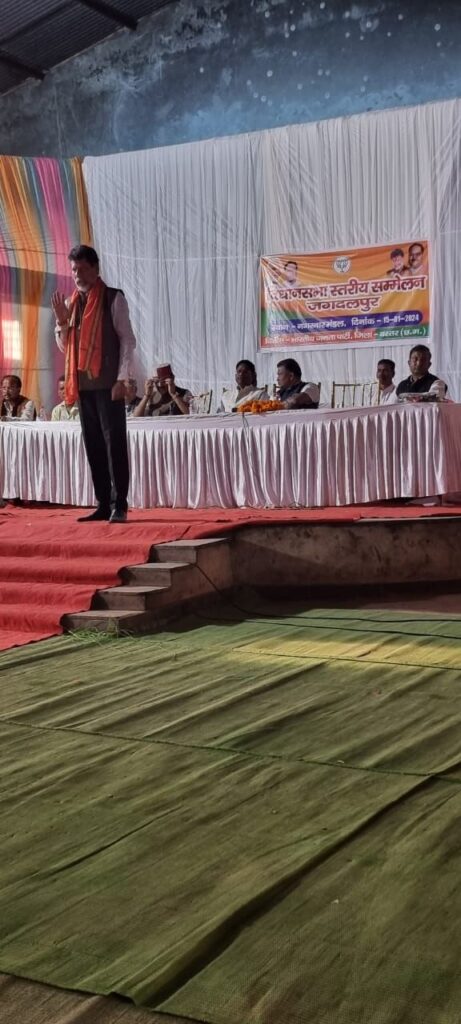 आज सोमवार को भाजपा नगरनार मंडल द्वारा जगदलपुर विधानसभा क्षेत्र स्तरीय सम्मेलन का आयोजन किया गया। इस दौरान भाजपा के प्रदेश अध्यक्ष एवं क्षेत्रीय विधायक किरण सिंह देव विशेष रूप से उपस्थित थे। कार्यक्रम में विशेष रूप से अयोध्या में 22 जनवरी को रामलला की प्रतिमा की प्राण प्रतिष्ठा को लेकर प्रस्ताव रखा गया कि प्रधानमंत्री की मंशा के अनुसार क्षेत्र के सभी मंदिरों की साफ सफाई एवं वहां पर नियमित रूप से दीप जलाया जाए, पार्टी कार्यकर्ता अपने घरों में भी दीपमाला सजाएं। साथ ही जो भी व्यक्ति 22 जनवरी को अयोध्या रामलला के दर्शन हेतु जाना चाहते हैं, वे अवश्य इस अवसर पर अयोध्या जाकर रामलाल के दर्शन करें। इस दौरान मंडल भाजपा प्रभारी राम आशीष, महिला मोर्चा मंडल अध्यक्ष गीता मिश्रा समेत बड़ी संख्या में भाजपा कार्यकर्ता उपस्थित थे।
