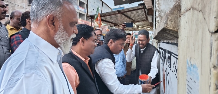 जगदलपुर :- भारतीय जनता पार्टी ने लोकसभा चुनाव के लिए तैयारियां शुरू कर दी है। भाजपा के पक्ष में वातावरण बनाने नारे लिखकर चुनाव चिन्ह कमल फूल के निशान की वाॅल पेंटिंग का काम जोरशोर से आरंभ है। वनमंत्री केदार कश्यप ने मंगलवार को शहर के मोतीलाल नेहरू वार्ड में स्वयं वाॅलपेंटिग की और वार्ड के निवासियों व लोगों से भेंटकर भाजपा के लिए मतदान की अपील की।