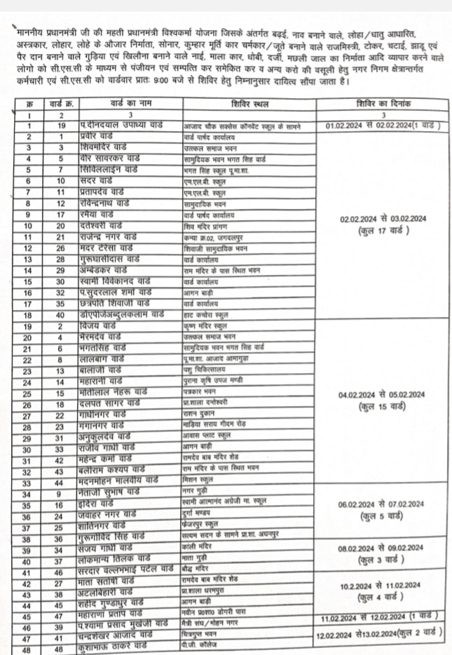 जगदलपुर :- केंद्र सरकार की प्रधानमंत्री विश्वकर्मा योजना के तहत आवेदन लेने और राजस्व वसूली के लिए नगर निगम द्वारा सभी 48 वार्डों में 1 से 13 फरवरी तक शिविर का आयोजन किया जाएगा। शिविर में प्रधानमंत्री विश्वकर्मा योजना के तहत आवेदकों का पंजीयन किया जाएगा और शहरवासियों से समेकित कर, संपत्ति कर व अन्य करों की वसूली की जाएगी।