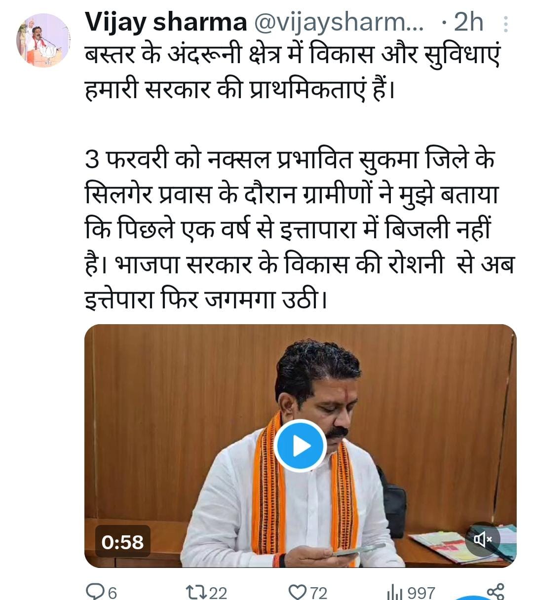 जगदलपुर(अर्जुन झा ):- प्रधानमंत्री नरेंद्र मोदी के कामकाज के तरीकों की झलक छत्तीसगढ़ के उप मुख्यमंत्री एवं गृहमंत्री विजय शर्मा के भी कामकाज में नजर आती है। प्रधानमंत्री श्री मोदी की तरह ही श्री शर्मा भी किसी काम को शुरू कराकर यूं ही नहीं छोड़ देते, बल्कि अंजाम तक पहुंचाते भी हैं और कार्य से प्रभावित होने वाले लोगों के संपर्क में भी रहते हैं। इसका एक उदाहरण बस्तर संभाग के सुकमा जिले में सामने आया है।