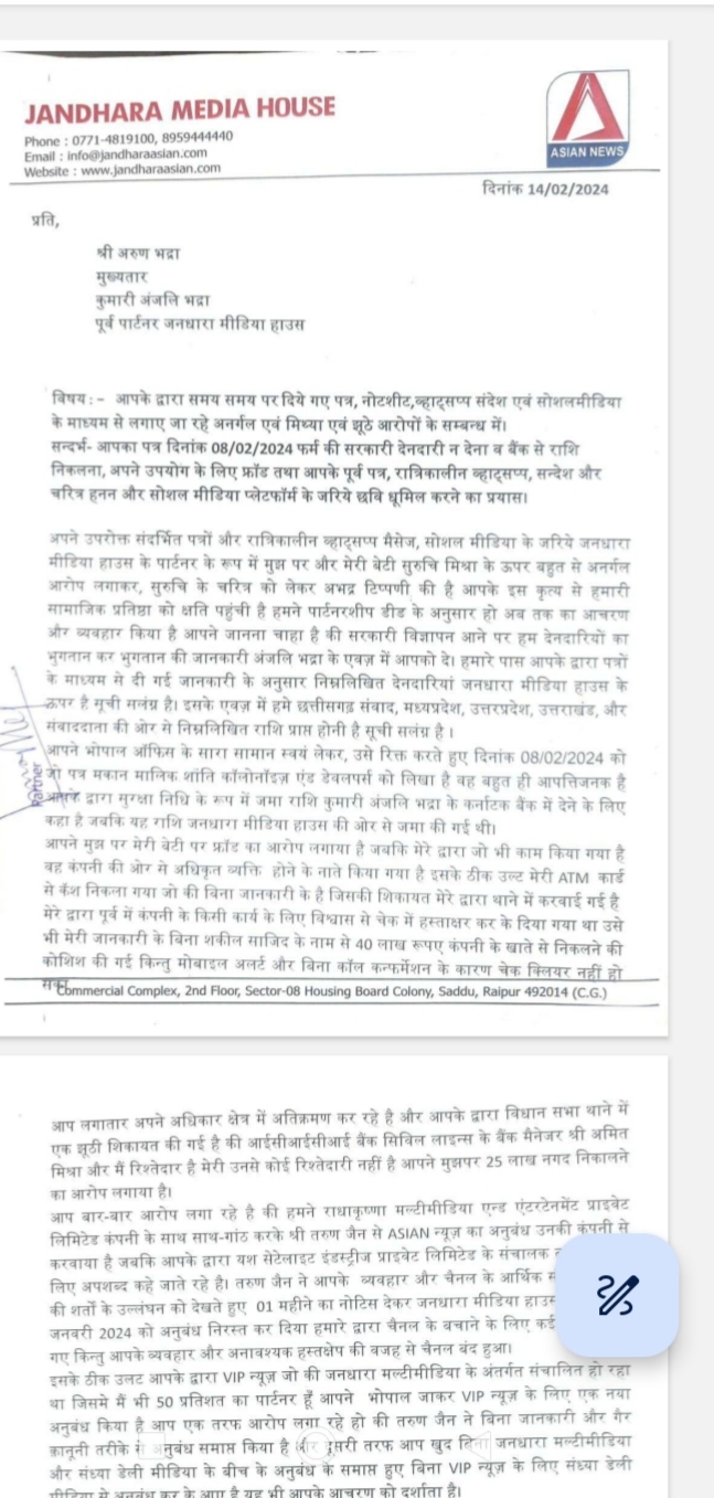 ऐसा ही दुस्साहस छत्तीसगढ़ की राजधानी रायपुर में हुआ है, जहां कांग्रेस से जुड़े अरुण भद्रा नाम के शख्स ने अपनी बेटी के माध्यम से मीडिया में घुसपैठ करने की कोशिश की इस दौरान वो खुद को बड़ा राजनेता और बिल्डर बताकर पत्रकारों पर रौब जमाना, शाम होते ही पत्रकारों को फोन करना और उन्हें नौकरी से निकलवा देने की धमकी देना हर छोटे बड़े कर्मचारी को मैं मालिक हूं मेरे पैसे पर पल रहे हो कहकर सरेआम बेज्जती करना आम बात है। मीडिया से जुड़ा हर शख्स जानता है कि पत्रकार को अपना आत्म सम्मान सबसे ज्यादा प्यारा होता है। कुछ मीडिया कर्मियों ने अरुण भद्रा के इस व्यवहार से तंग आकर एशियन न्यूज से नाता तोड़ लिया है। इसके बाद अरुण भद्रा ने अपनी सीमाएं लांघते हुए संपादकीय कार्यों में दखल देना शुरू कर दिया। इससे खिन्न होकर एशियन न्यूज के संपादक, आउटपुट इंचार्ज को काम करना मुश्किल हो गया। देर रात संपादकीय कार्यों को लेकर फोन पर अभद्रता दिनों दिन बढ़ती चली गई। विधानसभा चुनाव के दौरान ही संपादक, आउटपुट इंचार्ज, सेल्स हैड को नौकरी छोड़नी पड़ गई. अरुण भद्रा चुनाव के दौरान हर जिले में बतौर राजनेता दौरा करते थे और चाहते थे जिला संवाददाता उनके स्वागत में खड़े नजर आएं।ऐसा नहीं करने वाले जिला संवाददाताओं को विज्ञापन के लिए धमकाना रोजमर्रा का काम हो गया। इसी तरह दखलंदाजी, समय पर वेतन नहीं देना और चैनल के लाइसेंसधारी यश सैटेलाइट को एग्रीमेंट के मुताबिक समय पर पेमेंट नहीं करने के कारण चैनल की हालत दिनों दिन बिगड़ती गई। इनके बर्ताव से तंग आकर यश सैटेलाइट ने भी जनधारा मीडिया हाऊस से अपना अनुबंध निरस्त करके राधे कृष्ण मल्टी मीडिया एंड एंटरटेनमेंट प्रायवेट लिमिटेड से अपना नया अनुबंध कर लिया। अब अरुण भद्रा का मीडिया संचालक बनने का सपना चूर चूर हो गया। बौखलाहट में वे अब राधे कृष्ण मल्टी मीडिया एंड एंटरटेनमेंट प्रायवेट लिमिटेड द्वारा नियुक्त मीडिया कर्मियों को भी धमकाने से बाज नहीं आ रहे हैं। आएदिन किसी को भी उठा लेने, जेल भिजवा देने की धमकी दी जा रही है। कई जिलों के संवाददाताओं को एशियन न्यूज की आईडी इस्तेमाल करने से रोका जा रहा है। इससे जुड़े कई दस्तावेज हाथ लगे हैं।
