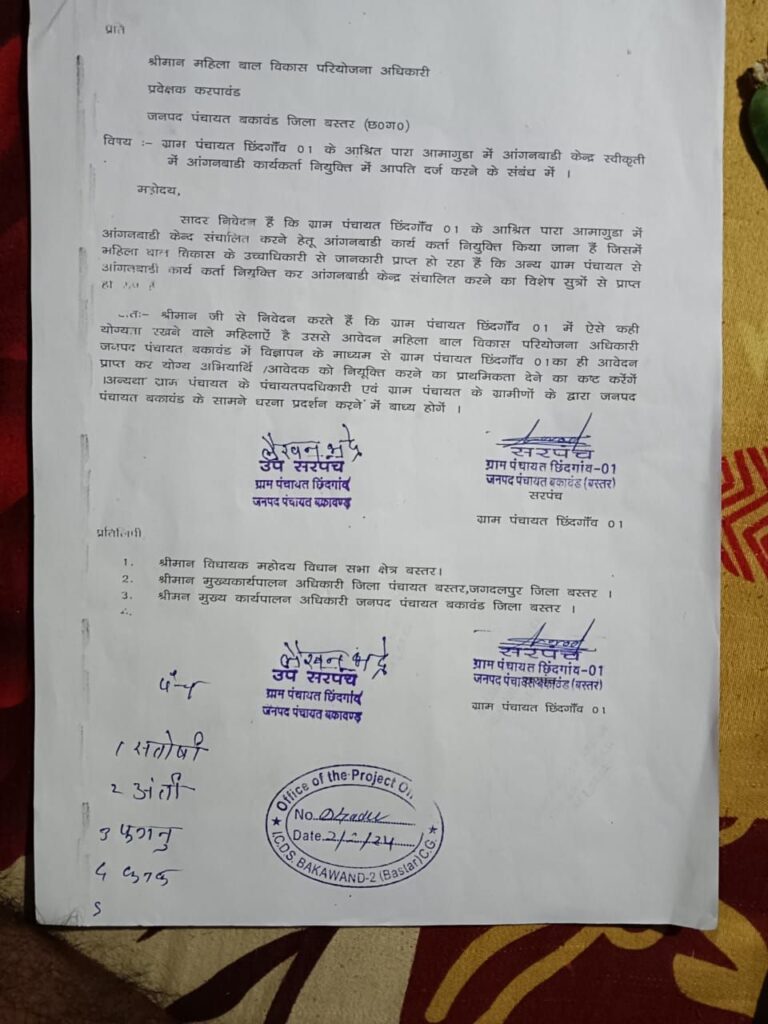 बकावंड (अर्जुन झा ):- जनपद पंचायत बकावंड की ग्राम पंचायत छिंदगांव -1 में आंगनबाड़ी कार्यकर्ता की नियुक्ति का मामला तूल पकड़ चुका है।खबर है कि कार्यकर्ता नियुक्ति में फर्जीवाड़ा किया जा रहा है।इसमें करपावंड की परियोजना अधिकारी और पर्यवेक्षक की भूमिका पर उंगली उठ रही है।ग्रामीणों और पंचायत प्रतिनिधियों ने बाहरी की नियुक्ति के खिलाफ जनपद पंचायत कार्यालय का घेराव और प्रदर्शन करने की चेतावनी दे दी है।