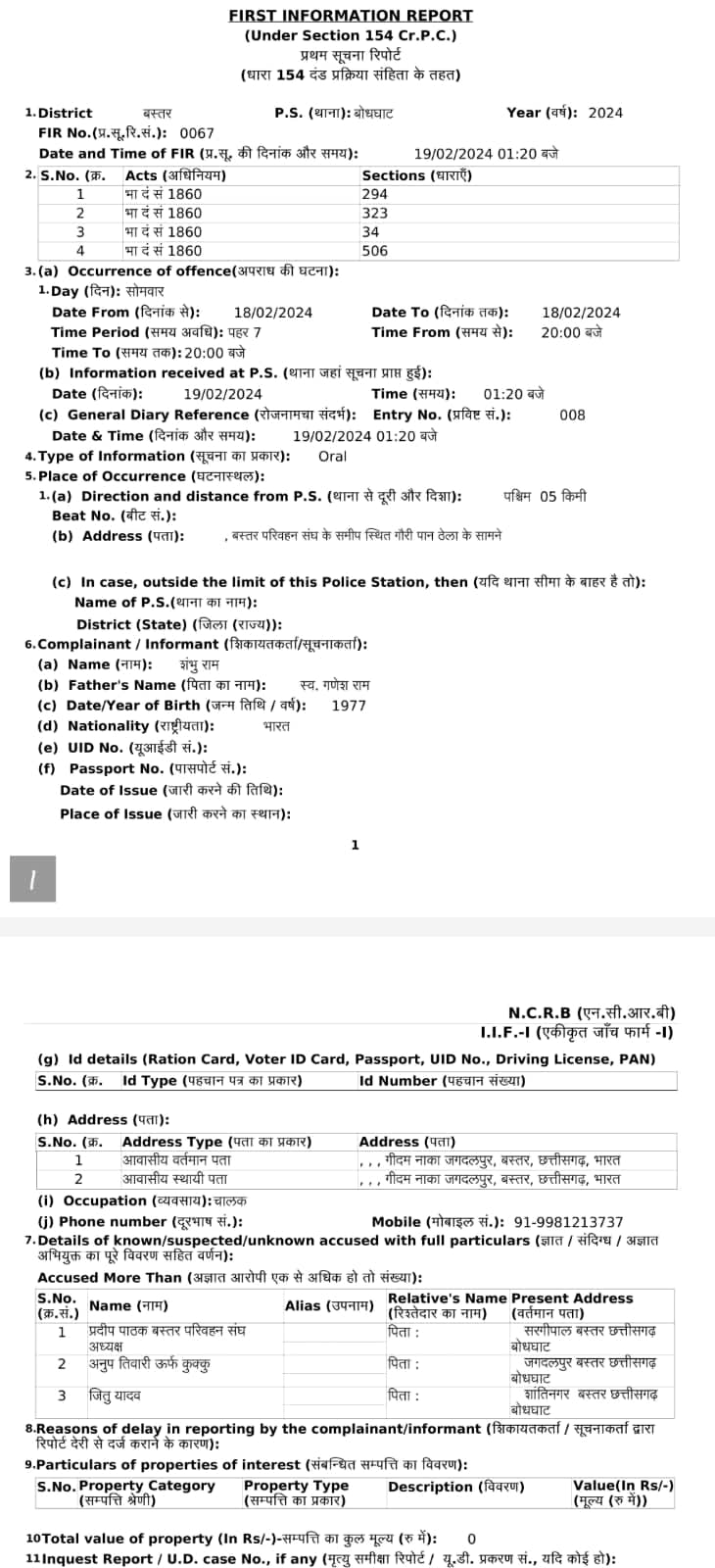 बस्तर परिवहन संघ अध्यक्ष सहित तीन के खिलाफ एफआईआर दर्ज