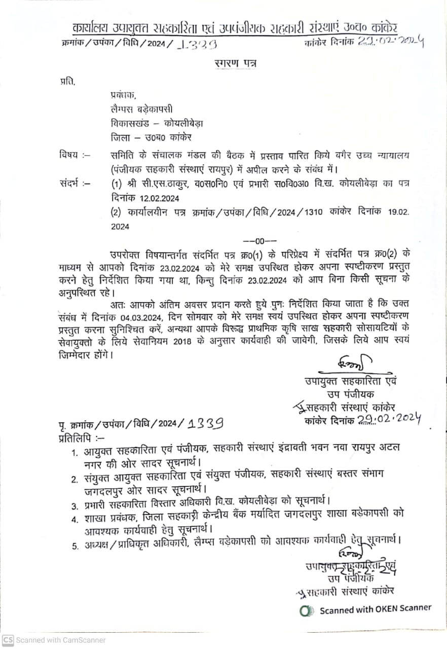 छोटे कपसी (राजदीप शर्मा ):- कापसी/प्रभारी प्रबंधक मुकुंद राय लैंप्स बड़े कापसी दिनांक 23,02, 2024 को न्यायालय उप पंजीयक सहकारी संस्थाएं कांकेर में अपना स्पष्टीकरण प्रस्तुत करने उपस्थित नहीं हुए तो न्यायालय उप पंजीयक ने प्रभारी प्रबंधक मुकुंद राय को अपना स्पष्टीकरण प्रस्तुत करने अंतिम अवसर प्रदान करते हुए उपायुक्त सहकारिता एवं उप पंजीयक सहकारी संस्थाएं कांकेर ने स्मरण पत्र प्रेषित किया है स्मरण पत्र क्रमांक/उ प का/विधि/2024/1339 कांकेर दिनांक 29,02, 2024 के माध्यम से मुकुंद राय प्रभारी प्रबंधक को दिनांक 4 3.2024 दिन सोमवार को माननीय उपायुक्त एवं उप पंजीयक सहकारी संस्थाएं कांकेर में उपस्थित होना है ज्ञात हो कि करोड़ों रुपए के हाइब्रिड बीज वितरण घोटाले मामले में पूर्व प्रबंधक को बचाने वर्तमान प्रबंधक मुकुंद राय ने अपने अधिकारी के स्थगन आदेश को चैलेंज कर फर्जी तरीके से रायपुर पंजीयक को अपील किया गया था जिसके तारतम्य में प्रभारी प्रबंधक मुकुंद राय को अपना स्पष्टीकरण बताओ नोटिस जारी किया गया था दिनांक 23 ,02 2024 बिना सूचना के प्रभारी प्रबंधक अनुपस्थित रहे स्मरण पत्र के माध्यम से सूचित किया गया है की प्रभारी प्रबंधक मुकुंद राय को अंतिम अवसर प्रदान किया जा रहा है इस अवसर पर वह खुद उपस्थित होकर स्पष्टीकरण नहीं देने की स्थिति में सेवा नियम 2018 के अनुसार कार्रवाई की जाएगी इसके लिए प्रभारी प्रबंधक मुकुंद राय स्वयं जिम्मेदार होंगे इस संबंध में पूर्व लैंप्स के अध्यक्ष किशोर नाग ने बतलाया प्रभारी प्रबंधक मुकुंद राय ने जब माननीय उच्च न्यायालय पंजीयक रायपुर में अपील प्रस्तुत किया तब मैं अध्यक्ष मनोनीत था उसके बावजूद बिना बैठक बुलाए फर्जी तरीके से अपील करना दुर्भाग्यपूर्ण है जांच होनी चाहिए