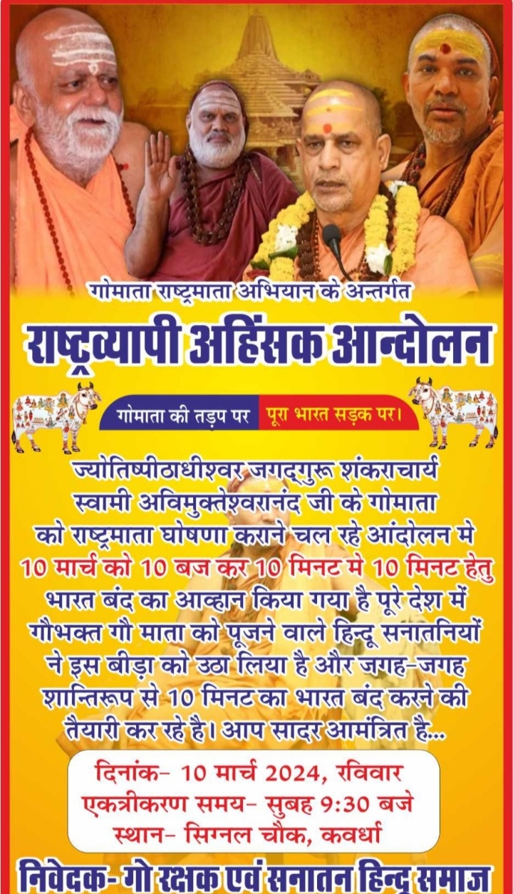 ज्योतिष्पीठाधीश्वर जगद्गुरु शंकराचार्य के गौमाता को राष्ट्रमाता घोषणा कराने चल रहे आंदोलन में 10 मार्च को 10 मिनट हेतु भारत बंद का आह्वान किया गया है पूरे देश मे गौभक्त गौ माता को पूजने वाले हिन्दू सनातनियों ने इस बीड़ा को उठा लिया है और जगह जगह शान्तिरूप से 10 मिनट का भारत बंद करने की अपील कर रहे है