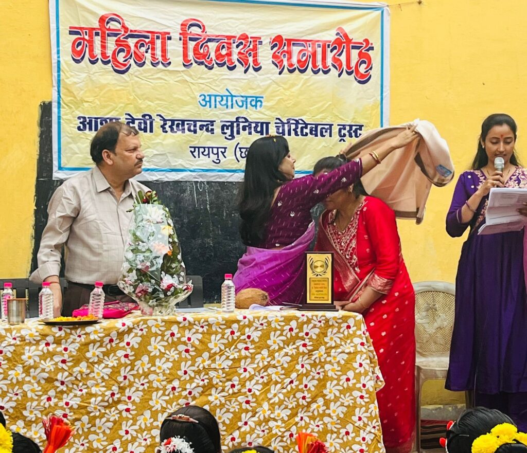 सरस्वती शिशु मंदिर टिकरापारा रायपुर में आशा देवी रेखचंद लुनिया चेरिटेबल ट्रस्ट द्वारा समाज के अलग अलग क्षेत्रों में उल्लेखनीय योगदान देने वाली महिलाओं को उत्कृष्ट महिला सम्मान प्रदान किया गया। कार्यक्रम में मुख्य अतिथि गोपा सान्याल पत्रकार एवं गायिका शास्रीय एवं लोक संगीत, विशेष अतिथि छतीसगढ़ डिफेंस अकादमी के रूपेंद्र साहू थे। अध्यक्षता डीपी गोस्वामी संचालक सैनिक मिलिट्री रिम्स ने की। कार्यक्रम प्रभारी पीयूष जैन विशेष रूप से उपस्थित थे। महिला सम्मान समारोह में आकांक्षा तिवारी को पशु सेवा, हरिता पटेल को महिला सशक्तिकरण, डॉ. साधना सिंह को चिकित्सा, गीतांजलि पंकज को खेल, डॉ प्रियंका मिश्रा पचौरी को अनुसंधान के क्षेत्र में सम्मनित किया गया। इस अवसर पर सरस्वती शिशु मंदिर की शिक्षिकाएं भी उपस्थित थीं। प्रधानाचार्य हेमलता यादव, तुलसी श्रीवास, सरोजनी यदु, आरती गोस्वामी, द्रोपदी साहू, भूमिका साहू, अमिता यादव, माधुरी सेन, सुनीता यादव, न्यू विजन पब्लिक स्कूल से मधुलिता मिश्रा , नीता साहू, राधिका झारिया, भाग्यश्री नसरे, नीलम मिश्रा, नीलिमा तिवारी, छतीसगढ़ डिफेंस से हेमलता साहू, सैनिक मिलिट्री रिम्स से अनिकेता भारद्वाज, गीता सिन्हा, मां दुर्गा महिला समिति से लक्ष्मी साय, सुरजा बाई नागेश, नीता जैन, शांति सिन्हा आदि उपस्थित थीं, जिन्हें सम्मनित किया गया।
