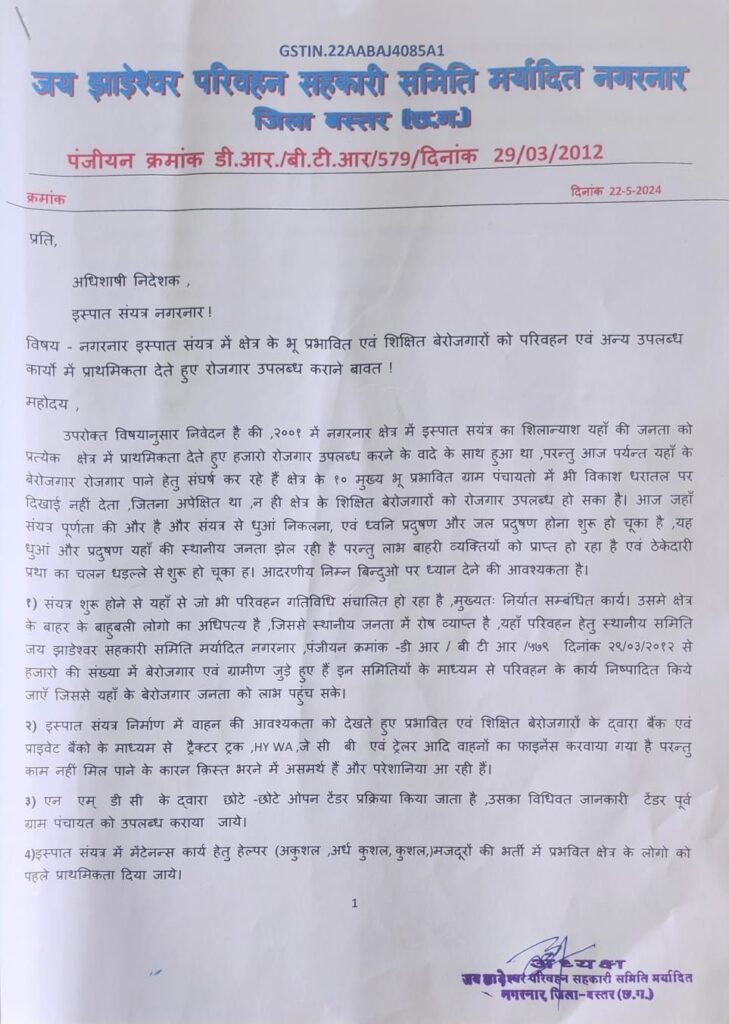 समिति के लोगों का कहना है कि नगरनार इस्पात संयत्र में क्षेत्र के भू प्रभावित एवं शिक्षित बेरोजगारों को परिवहन एवं अन्य कार्यों में प्राथमिकता देते हुए रोजगार उपलब्ध कराया जाना चाहिए। सन 2001 में नगरनार में इस्पात सयंत्र का शिलान्यास यहां की जनता को प्रत्येक क्षेत्र में प्राथमिकता देते हुए हजारों रोजगार उपलब्ध करने के वादे के साथ हुआ था, परंतु आज तक यहां के बेरोजगार रोजगार पाने हेतु संघर्ष कर रहे हैं। क्षेत्र की दस मुख्य भू प्रभावित ग्राम पंचायतो में भी विकास धरातल पर दिखाई नहीं दे रहा है। आज संयंत्र पूर्णता की ओर है और संयत्र से उठने वाले धुएं एवं ध्वनि के प्रदूषण और जल प्रदूषण की मार स्थानीय लोग झेल रहे हैं। परंतु लाभ बाहरी व्यक्तियों को प्राप्त हो रहा है। संयंत्र में ठेकेदारी प्रथा का चलन धड़ल्ले से शुरू हो चुका है। समिति ने कहा है कि संयत्र शुरू होने के बाद यहां से जो भी परिवहन गतिविधि संचालित हो रही है, निर्यात सम्बंधित कार्य में बाहर के बाहुबली लोगों का आधिपत्य है। इससे स्थानीय जनता में रोष व्याप्त है। परिवहन हेतु स्थानीय समिति जय झाडेश्वर सहकारी समिति मर्यादित नगरनार से हजारों की संख्या में बेरोजगार एवं ग्रामीण जुड़े हुए हैं। इन समिति के माध्यम से परिवहन के कार्य निष्पादित किये जाएं जिससे यहां के बेरोजगारों को लाभ मिल सके। इस्पात संयत्र निर्माण में वाहन की आवश्यकता को देखते हुए प्रभावित एवं शिक्षित बेरोजगारों द्वारा राष्ट्रीयकृत एवं प्राइवेट बैंकों से ट्रैक्टर, ट्रक, हाईवा, जेसीबी, ट्रेलर आदि वाहन फाइनेंस करवाकर लिए गए हैं, लेकिन उन्हें काम नहीं मिल रहा है। लिहाजा वे किस्त भरने में असमर्थ हैं और परेशानी झेल रहे हैं। एनएमडीसी द्वारा छोटे -छोटे ओपन टेंडर प्रक्रिया अपनाई जाती है, उसकी विधिवत जानकारी टेंडर पूर्व ग्राम पंचायतों को उपलब्ध कराई जानी चाहिए। इस्पात संयत्र में मेंटेनेंस कार्य हेतु हेल्पर हेतु अकुशल अर्ध कुशल, कुशल, मजदूरों की भर्ती में प्रभवित क्षेत्र के लोगों को पहले प्राथमिकता दी जानी चाहिए। जय झाड़ेश्वर परिवहन सहकारी समिति मर्यादित नगरनार ने उक्त सभी मुद्दों को दृष्टिगत रखते हुए जल्द से जल्द स्थानीय परिवहन समिति तथा क्षेत्रीय बेरोजगारों के हित में निर्णय लेने का आग्रह अधिशासी निदेशक से किया है।