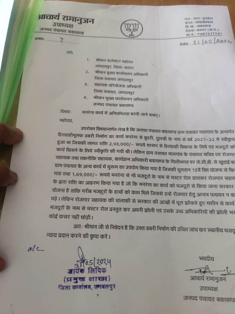 ग्राम पंचायत मालगांव में चल रही गड़बड़ी और सरकारी धन की बंदरबांट की सिलसिलेवार शिकायत जनपद पंचायत बकावंड के उपाध्यक्ष एवं वरिष्ठ भाजपा नेता आचार्य रामानुजम ने वरिष्ठ अधिकारियों से की है। आचार्य रामानुजम ने बस्तर के कलेक्टर, जिला पंचायत सीईओ, मनरेगा के जिला पंचायत में पदस्थ सहायक परियोजना अधिकारी और बकावंड जनपद पंचायत के मुख्य कार्यपालन अधिकारी से मालगांव ग्राम पंचायत में मनरेगा के नाम पर की गई आर्थिक गड़बड़ी से जुड़े संपूर्ण मामले की लिखित शिकायत की है। आचार्य रामानुजम ने डबरी निर्माण की जांच कर दोषी लोगों के खिलाफ कार्रवाई की मांग की है।