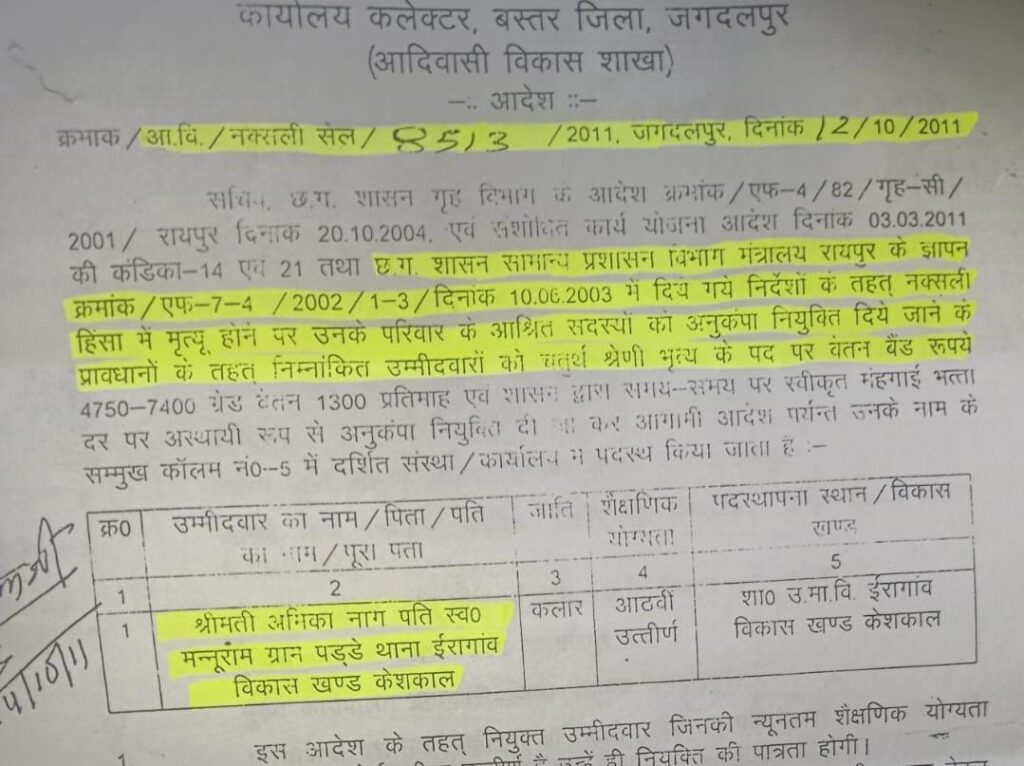 नक्सली हिंसा में मौत पर अनुकंपा नियुक्ति के नियम शर्त की कंडिका क्रमांक 10 में प्रावधान है कि अनुकंपा नियुक्ति पाने वाले उम्मीदवार को मृतक के समस्त आश्रित सदस्यों के भरण पोषण की सम्पूर्ण जिम्मेदारी का निर्वाह करना अनिवार्य होगा। इस लिहाज से अनुकंपा नियुक्ति प्राप्त अमिका नाग का कर्तव्य बनता था कि वह अपने दिवंगत पति मन्नूराम नाग के माता पिता, अन्य आश्रित परिजनों का भरण पोषण करती। मगर नक्सली हिंसा में मृत मन्नूराम नाग के आश्रित सभी सदस्यों के भरण पोषण की बात तो दूर, अमिका नाग अपने ही कोख से जन्मे और पूरी तरह उस पर निर्भर अपने नाबालिग बच्चों को भी बेसहारा छोड़ नया पति बनाकर उसके साथ रंगरलियां मनाने चली गई।