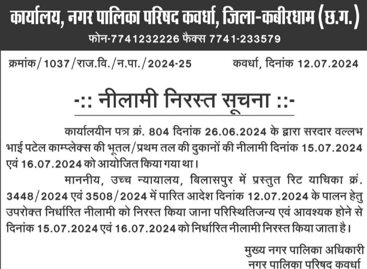 अब एक बार फिर से मनोनीत अध्यक्ष के समर्थित सीएमओ ने उच्च न्यायालय में लंबित प्रकरण के विरुद्ध कानून व्यवस्था से खिलवाड़ करते हुए उच्च न्यायालय के मान की अवहेलना करते हुए कवर्धा स्थित सरदार वल्लभ भाई पटेल कॉम्प्लेक्स की नीलामी तिथि जारी कर दी है ।