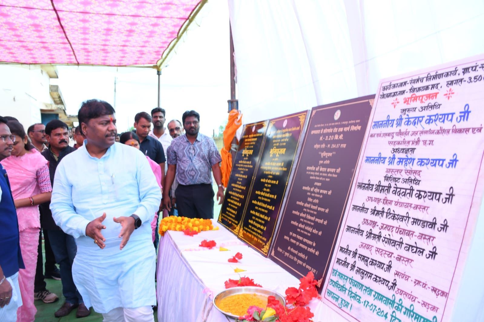 जगदलपुर :- प्रदेश के वनमंत्री व नारायणपुर के विधायक केदार कश्यप ने आज नारायणपुर विधानसभा क्षेत्र के ग्राम भानपुरी, फरसागुड़ा व खंडसरा में विभिन्न निर्माण कार्यों का भूमिपूजन किया। इस अवसर पर मंत्री केदार कश्यप ने कहा कि विगत छः माह में राज्य सरकार द्वारा किसानों एवं आम लोगों के लिए अनेक कल्याणकारी योजनाओं का सफल क्रियान्वयन कर सभी वर्गों को लाभांवित किया जा रहा है।