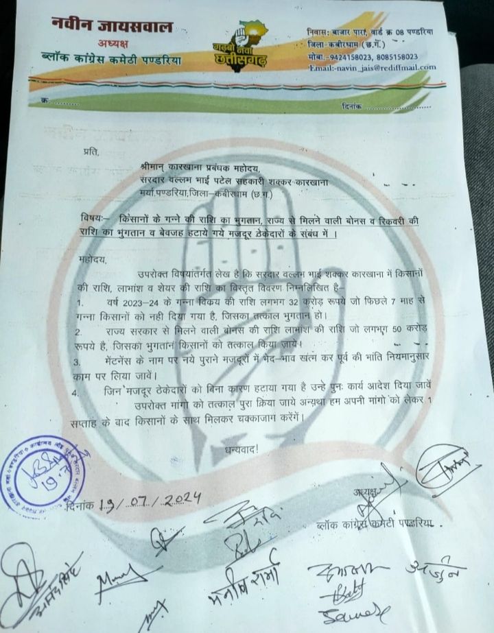 कवर्धा,,पंडरिया- पंडरिया छेत्र के गन्ना उत्पादक किसानों की समस्या दिन प्रतिदिन बढ़ती ही जा रही है खेती किसानी का समय पर किसानों को साहूकारों से ब्याज में पैसे लेकर किसानी काम करना पड़ रहा है और इन सबका का कारण है कि पंडरिया शक्कर कारखाना में जिन किसानों ने गन्ना बेचा था उनको आज गन्ना बेचने के 7 माह बीत जाने के बाद भी भुगतान नहीं किया जा सका है जिसकी जल्द भुगतान के लिए आज कांग्रेस पार्टी द्वारा जल्द भुगतान की मांग की गई है