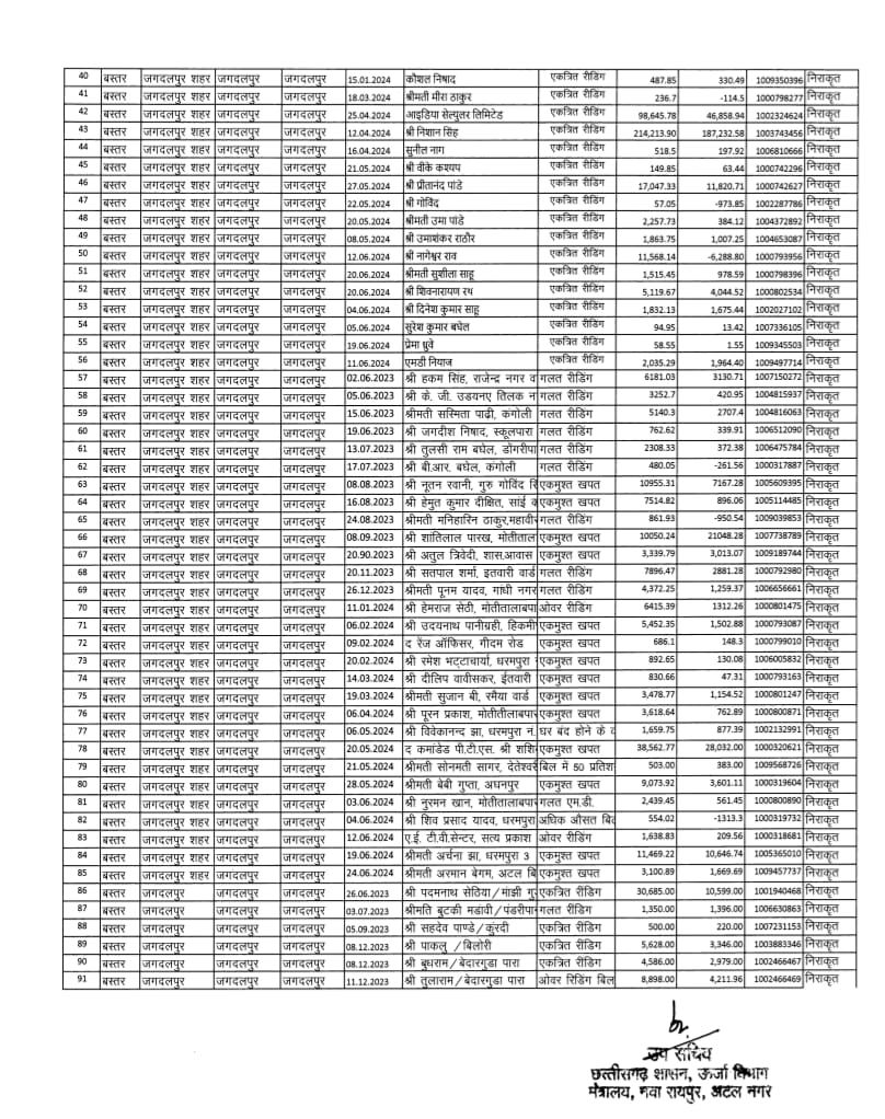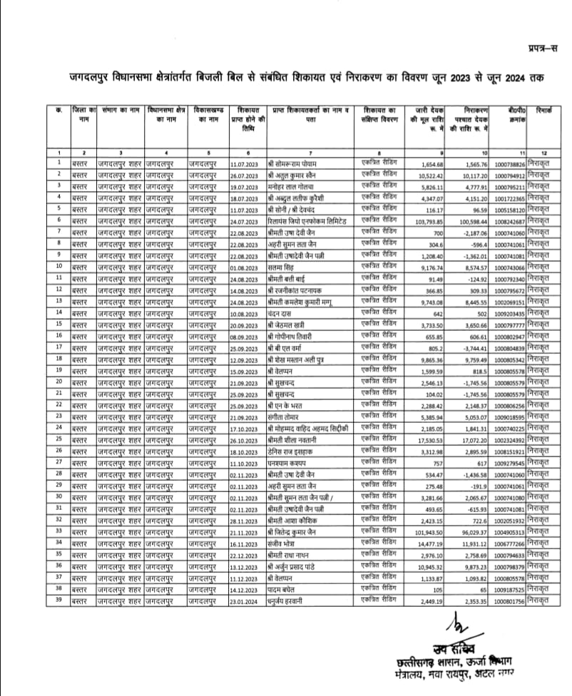 विद्युत वितरण कंपनी ने विधायक को बताया है कि अधिक बिजली बिल आने की शिकायतें एवं प्राप्त शिकायतों पर 169 लोगों की शिकायतों की जांच की गई और उनका निराकरण किया गया। बिजली बिल में गलत रीडिंग, एकमुश्त रीडिंग जैसे मामले सामने आए थे जिसे निराकृत करने की बात विभाग ने स्वयं स्वीकार की है। नेतानार, पंडरीपानी एवं ईतवारी बाजार में नए उपकेंद्र