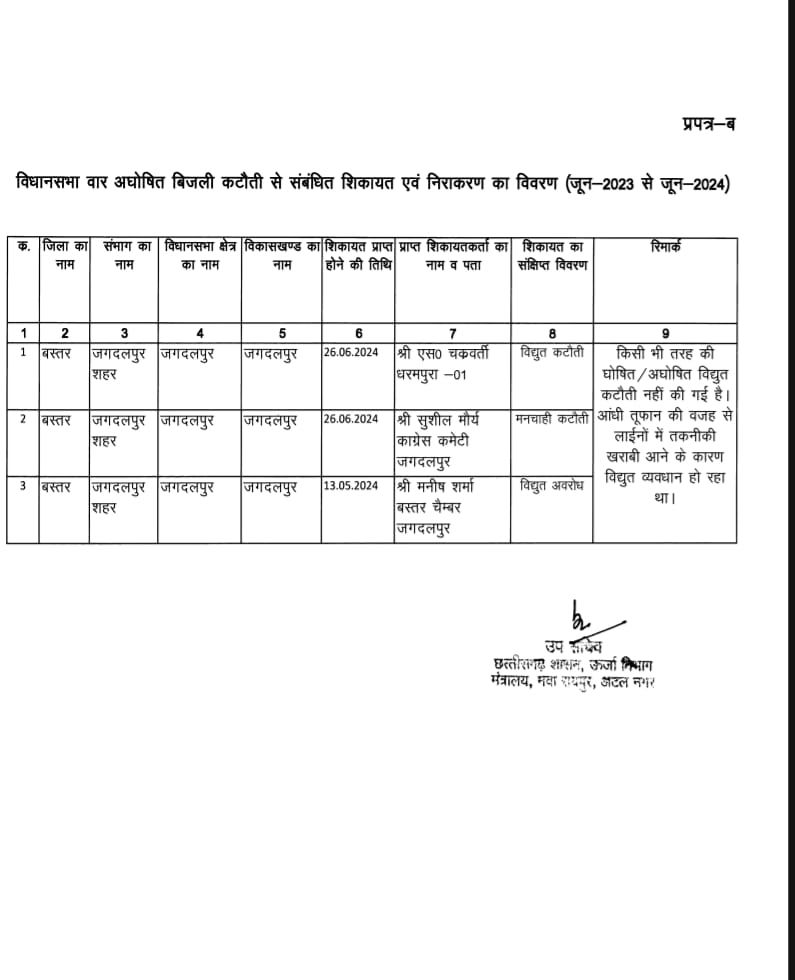विद्युत व्यवस्था लड़खड़ाने के कारण जहां हजारों उपभोक्ताओं को परेशानी उठानी पड़ी, तो जगदलपुर विधानसभा क्षेत्र अंतर्गत केवल तीन उपभोक्ताओं ने इसकी शिकायत की। यह दावा विद्युत कंपनी का है। यह किसी के गले नहीं उतर रहा है लेकिन जगदलपुर विधायक किरण देव को जो जानकारी दी गई है उसके अनुसार बस्तर चेम्बर ऑफ कामर्स के अध्यक्ष मनीष शर्मा, कांग्रेस पार्टी के सुशील मौर्य व धरमपुरा क्रं-1 के एस चक्रवर्ती ने शिकायत दर्ज कराई थी। विद्युत वितरण कंपनी के उपभोक्ताओं द्वारा बिजली की अघोषित कटौती संबंधित शिकायतें एवं उनका निराकरण किए जाने का दावा किया गया है।