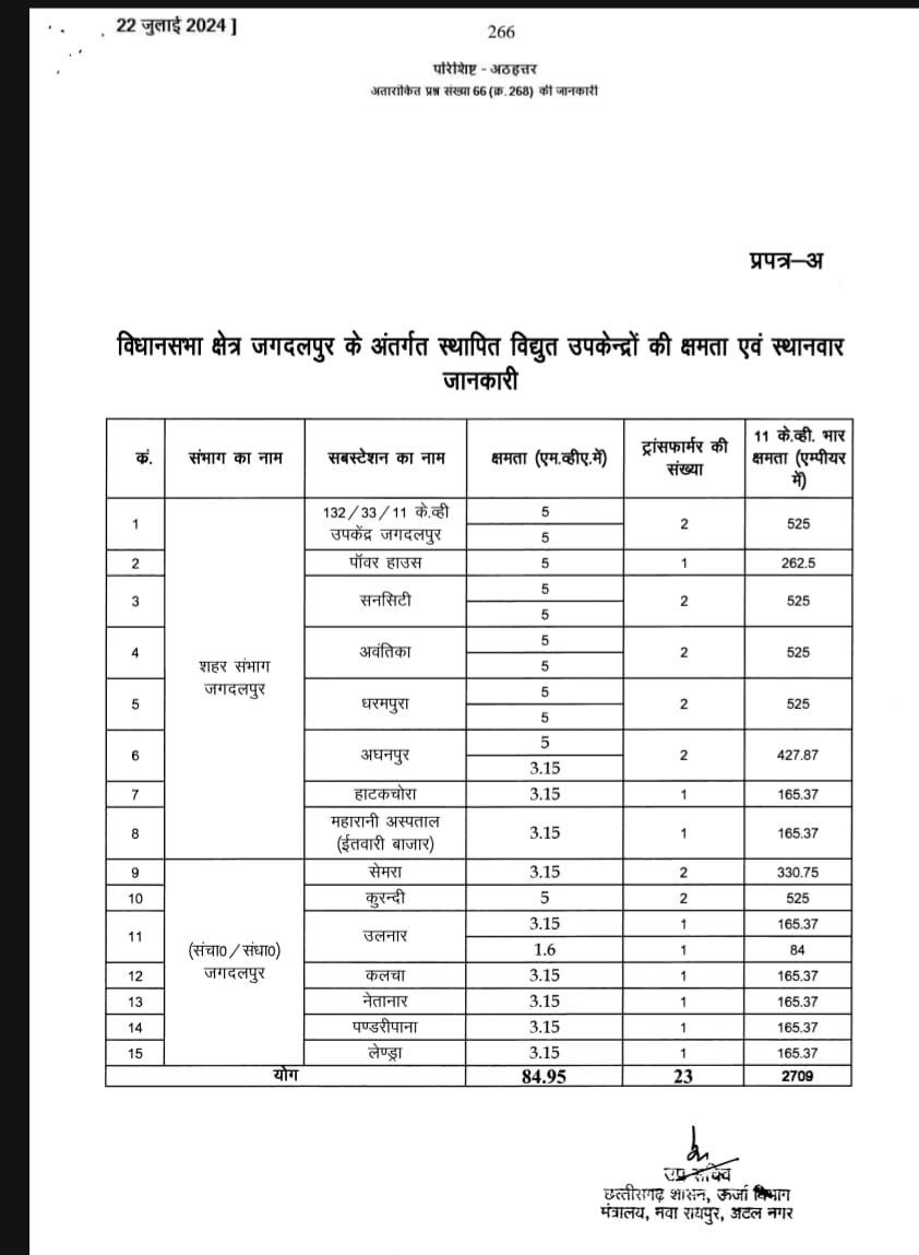 *जगदलपुर।* बस्तर जिले के शहरी क्षेत्र के अलावा जगदलपुर विधानसभा क्षेत्र में विद्युत व्यवस्था के लिए 33/11 केव्ही के 15 सब स्टेशन हैं। जून 2023 से जून 2024 तक कुल 15 सब स्टेशनों के 46 फीडरों में 550 बार पावर कट की समस्या आई। इस अवधि में कुल 498 घंटे बिजली बाधित रही जिसमें से 261 बार विद्युत व्यावधान पैदा हुआ। यह जानकारी प्रदेश भाजपा अध्यक्ष व जगदलपुर विधायक किरण देव को ऊर्जा विभाग द्वारा लिखित में दी गई है। इस वर्ष विद्युत व्यवस्था में जमकर व्यावधान उत्पन्न हुआ जिसके कारण भारतीय जनता पार्टी की बड़ी किरकिरी हुई। विद्युत व्यवस्था लड़खड़ाने में प्रमुख रूप से प्राकृतिक आपदा पेड़ों का गिरना, आकाशीय बिजली, तेज बारिश एवं आंधी-तूफान कारण रहे। इस दौरान बिजली 281 घंटे बाधित रही तथा 289 बार विद्युत व्यावधान तकनीकी खराबी जंपर कटने, पिन इंसुलेटर ब्रस्ट होने, डिस्क इंसुलेटर फूटने, डीओ यूनिट फूटने, पेड़ की टहनियां गिरने के कारण हुआ। इन वजहों से 217 घंटे बिजली बाधित रही।