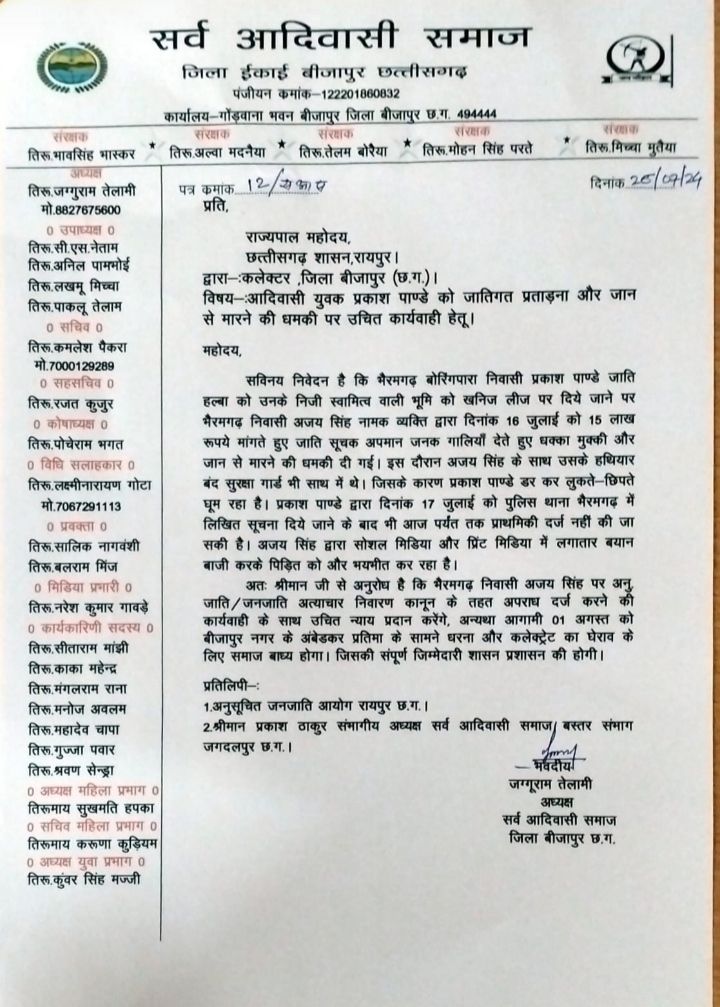 जगदलपुर :- निजी जमीन को खनिज लीज पर देने के नाम से बोरिंग पारा भैरमगढ़ निवासी आदिवासी युवक प्रकाश पांडे जाति हल्बा से 15 लाख रुपए की मांग करते हुए उसे अजय सिंह द्वारा जातिगत तौर पर प्रताड़ित व गाली गलौज किए जाने का आरोप सर्व आदिवासी समाज ने लगाया है। समाज ने इस मसले को लेकर राजयपाल को ज्ञापन भी सौंपा है। समाज ने अजय सिंह की गिरफ्तारी न होने पर कलेक्ट्रेट का घेराव करने की चेतावनी दी है।