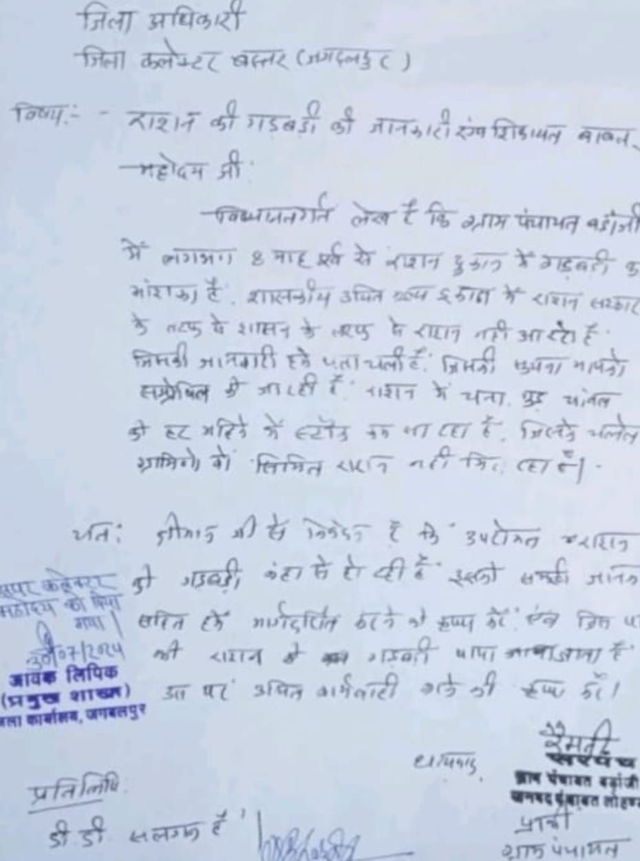सरपंच बडांजी के नेतृत्व में सैकड़ों लोगों ने कलेक्टोरेट पहुंचकर कलेक्टर विजय दयाराम की अनुपस्थिति में अपर कलेक्टर सीपी बघेल को ज्ञापन सौंपा जिसमें सिलसिलेवार राशन दुकान में हो रही अनियमितताओं पर प्रकाश डाला गया। अपर कलेक्टर ने इस मामले में जल्द से जल्द निराकरण किये जाने की बात कही।