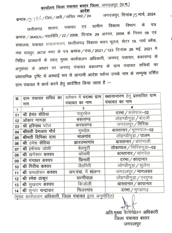 जनपद पंचायत बकावंड द्वारा जो तबादला सूची सामान्य सभा की अनुशंसा के बाद जिला पंचायत को प्रेषित की गई है, उसमें कुल 11 सचिवों के नाम हैं। जिला पंचायत के बाबू द्वारा सार्वजनिक की गई सूची की प्रति इस संवाददाता को भी मिली है। उसी सूची में दिए गए सचिवों के नाम हम दे रहे हैं। सचिव हरिनाथ पटेल राजनगर से करपावंड, सुखराम कश्यप किंजोली को राजनगर का अतिरिक्त प्रभार, श्याम लाल कश्यप छिंदगांव -1 से सांवरा पंचायत, सकरू राम कश्यप छोटे जीराखाल को छिंदगांव -1, धरम नाग को धनपुर से मोखागांव, नीलम कश्यप को सोनपुर से धनपुर, सुंदरनाथ चंद्राकर चिऊंरगांव को सोनपुर का अतिरिक्त प्रभार, प्रभुनाथ बघेल भिरिंडा को मैलबेड़ा, जयदेव सिंह ठाकुर कोलावल को भिरिंडा का अतिरिक्त प्रभार, पीलाराम बघेल बोरपदर को जनपद पंचायत तोकापाल और हाड़ीराम नायक चोलनार को बोरपदर का अतिरिक्त प्रभार।