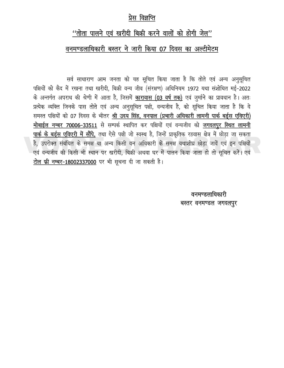 *जगदलपुर।* अगर आपने अपने घर में तोता पाल रखा है, तो सावधान हो जाइए। यह तोता आपको सरकारी पिंजरे में कैद करवा सकता है। मिट्ठू यानि तोता को घरों में पालना गैर कानूनी है। अगर किसी घर के पिंजरे में तोता पाया जाता है, तो उस घर के मालिक को सरकारी पिंजरे यानि जेल में कैद कर दिया जाएगा। बस्तर वन मंडल अधिकारी ने इस आशय का फरमान जारी कर दिया है।