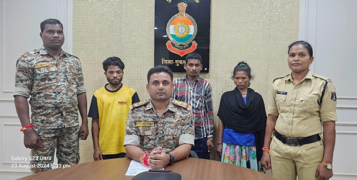 जगदलपुर :- बस्तर संभाग के सुकमा जिले के जगरगुंडा थाना क्षेत्र में अलग- अलग घटनाओं में शामिल 01 महिला सहित 3 नक्सलियों को विस्फोटक सामाग्री के साथ गिरफ्तार करने में सुरक्षा बलों को बड़ी सफलता मिली है। गिरफ्तार महिला नक्सली पर छग शासन द्वारा 2 लाख रूपए का ईनाम घोषित है।तीनो नक्सली थाना जगरगुंडा क्षेत्र के निवासी हैं।