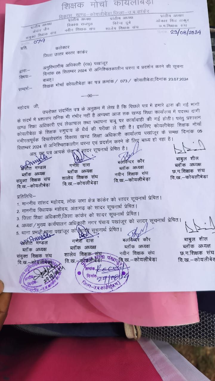 ज्ञात हो कि एरियर्स भुगतान में अनिमियता के कारण बीईओ एवं लेखपाल हटाओ कार्यालय बचाओ नारा के साथ शिक्षक मोर्चा विकासखंड कोयलीबेड़ा के शिक्षक ने अपना आंदोलन पिछली कांग्रेस सरकार के कार्यकाल में प्रारंभ किया था, इसके समर्थन में भाजपा के वर्तमान विधायक विक्रम देव उसेंडी,वर्तमान सांसद भोजराज नाग,नगर पंचायत अंतागढ़ अध्यक्ष राधेलाल नाग भी अपने-अपने समर्थन के साथ शिक्षक मोर्चा के बैनर तले बी ई ओ केजूराम सिन्हा को हटाने समर्थन दिया था स्थिति को देखते हुए तत्कालीन विधायक अपने दल बल के साथ शिक्षक मोर्चा आंदोलन कार्यस्थल पहुंचकर आंदोलन कर रहे शिक्षक मोर्चा के पद अधिकारी को जूस पिलाकर आंदोलन समाप्त किया था और उनके द्वारा कहा गया था की 15 दिन के भीतर बीईओ केजू राम सिंहा को हटा दिया जाएगा परंतु उनके कार्यकाल खत्म हो गया पर आज तक कोयलीबेड़ा शिक्षको की ज्वलंत सील समस्या का समाधान पिछली कांग्रेस सरकार के लगभग 12 महीने बीत जाने के बाद भी अभी तक बीईओ केजू राम सिंह को कोई नहीं हटाया। सरकार बदल गई है मगर अब तक शिक्षकों की मांग पूरा नहीं हो रहा है और न ही उनका एरियर्स जमा हुआ है जमा के नाम से गोल माल जबाब दिया जा रहा। असीत मंडल ब्लॉक अध्यक्ष संयुक्त शिक्षक संघ,गणेश दास ब्लॉक अध्यक्ष शालेय संघ,बलविंदर कोर ब्लॉक अध्यक्ष नवीन संघ,बबलू शील ब्लॉक अध्यक्ष छत्तीसगढ़ शिक्षक संघ कोयलीबेड़ा के द्वारा दिए गए आवेदन में उलेख है कि हमारे द्वारा दिये गए पिछले आवेदन क्रमांक 073 में की गई मांगो के प्रति प्रशासन तनिक भी गंभीर नही है। अन्यथा आज तक खंड शिक्षा कार्यालय में पदस्थ दागी खंड शिक्षा अधिकारी एवं लेखपाल तथा स्थापना शाखा बाबू पर कार्यवाही की गई होती। परन्तु प्रशासन कोयलीबेड़ा शिक्षक समुदाय के धैर्य की परीक्षा ले रहा है। नाराज हो कर शिक्षक संघ ने 05 सितंबर 2024 से अनिश्चितकालीन धरना प्रदशर्न करने के लिए आवेदन प्रस्तुत किया है।