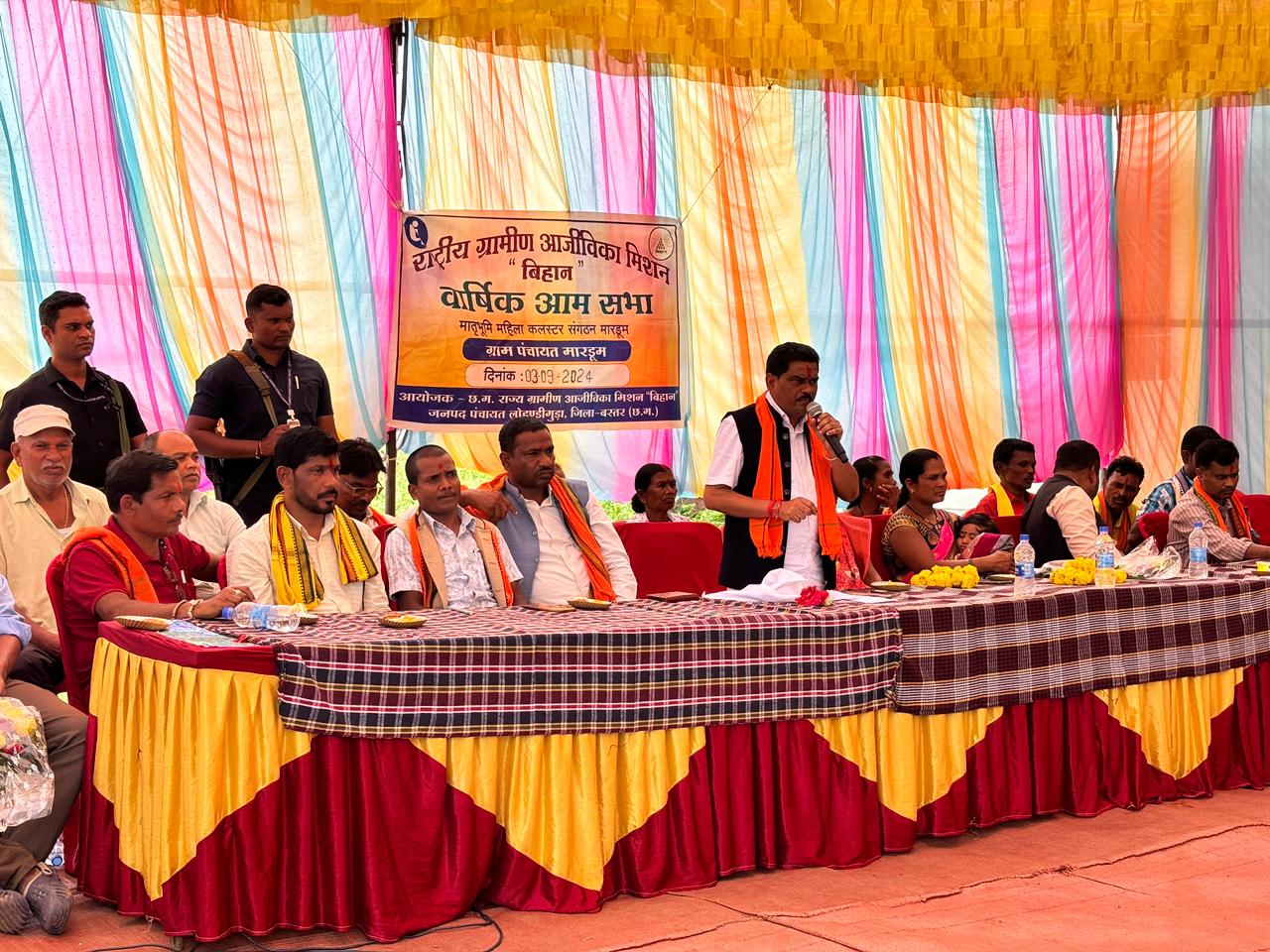 लोहंडीगुड़ा :- विकासखंड लोहंडीगुड़ा की ग्राम पंचायत मारडूम में राष्ट्रीय ग्रामीण आजीविका मिशन बिहान के तहत मातृभूमि महिला कलस्टर संगठन द्वारा आयोजित वार्षिक आमसभा में चित्रकोट के विधायक विनायक गोयल विशेष रूप से शामिल हुए।