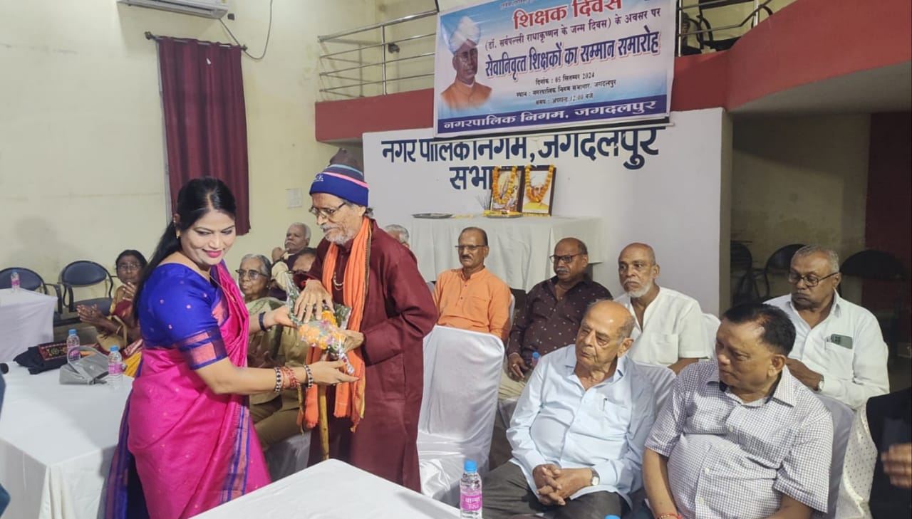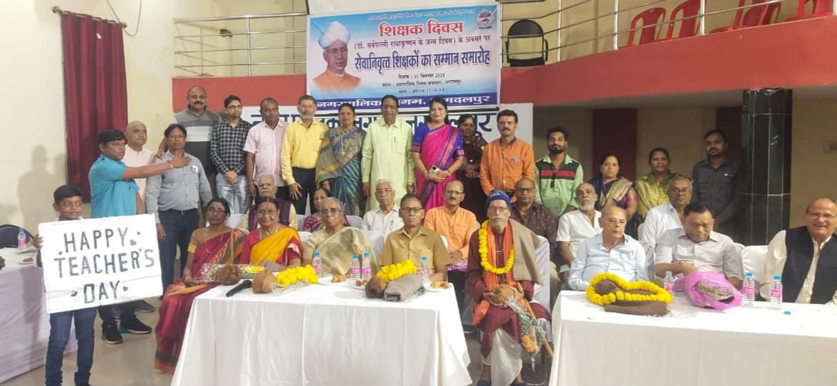 जगदलपुर नगर निगम द्वारा अपने इतिहास में rबार गुरूजनों का सम्मान किया गया है। मां सरस्वती व पूर्व राष्ट्रपति सर्वपल्ली डॉ. राधाकृष्णन के चित्रों पर माल्यार्पण व दीप प्रज्ज्वलन कर समारोह का शुभारंभ उपस्थित गुरूजनों ने किया। सम्मान समारोह में महापौर सफीरा साहू ने कहा कि गुरूजन सदैव सम्मानित व पूज्यनीय हैं। नगर निगम में पहली बार ऐसे आयोजन व गुरूजनों की उपस्थिति से नगर निगम परिवार अपने आप को गौरवान्वित महसूस कर रहा है। गुरुवरों के आशीर्वाद से ही हम सभी का जीवन सफल होता है। अध्यक्षीय उद्बोधन में एमआईसी सदस्य योगेंद्र पाण्डेय ने कहा कि गुरूजनों का सम्मान करते हुए हम सभी अभिभूत हैं, बिना गुरु की कृपा के कुछ भी संभव नहीं हैं। अपनी शिक्षा व समर्पण से राष्ट्र का भविष्य गढ़ने वाले गुरूजनों का सम्मान करते हुए हम सभी स्वयं सम्मानित हो रहे हैं। सम्मान समारोह में वरिष्ठ शिक्षक बीएनआर नायडू ने अपने संबोधन में आशीर्वचन दिया। नगर निगम द्वारा सेवानिवृत्त शिक्षक सज्जन अवस्थी, कृष्णमूर्ति शुक्ला, बीएनआर नायडू, शैलबाला श्रीवास्तव, अनिता राज, कस्तूरी मिश्रा, जोगेंद्र महापात्र, आरएम दास, सूरज साहू, नरसिंह रथ, अब्दुल सत्तार, जगमोहन दास, वामदेव मिश्रा, प्रकाश पंत व श्रीमती डेविड का सम्मान किया गया। कार्यक्रम का संचालन पं. राम रजनीश बाजपेयी ने और आभार प्रदर्शन नगर निगम आयुक्त हरेश मंडावी ने किया।समारोह में नगर निगम अध्यक्ष कविता साहू, एमआईसी सदस्य यशवर्धन राव, नरसिंह राव, आलोक अवस्थी, निर्मल पाणिग्रही, श्वेता बघेल, संजय पाण्डेय, त्रिवेणी रंधारी, नीलम यादव, महेन्द्र पटेल, शम्भू नाग, अनिल पिल्ले, मीनाक्षी नाग, विनय श्रीवास्तव, गोपाल भारद्वाज, रानू साहा , राकेश यादव, अमित, सुमीत महापात्र, दिनेश सिंह, कुलदीप पाणिग्रही, चंदन प्रजापति सहित निगम के अधिकारी कर्मचारी मौजूद रहे।