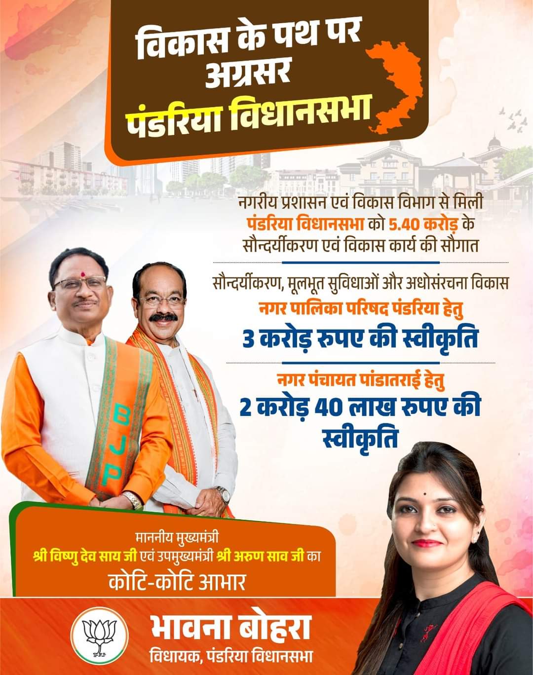 पंडरिया विधानसभा का समुचित विकास, जन सुविधाओं का विस्तार और स्वच्छता एवं सौंदर्यीकरण के लिए यह सौगात विकसित भारत-विकसित छत्तीसगढ़ के संकल्प एवं समृद्ध पंडरिया के लक्ष्य को पूरा करने में सार्थक सिद्ध होगा।