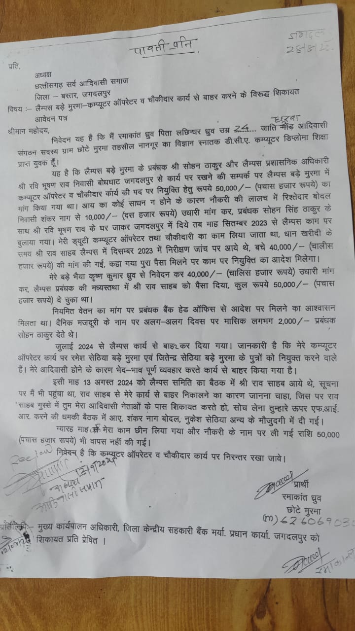 पीड़ित आदिवासी युवक रमाकांत ध्रुव ने मामले में सर्व आदिवासी समाज बस्तर जिला इकाई से इंसाफ दिलाने की गुहार लगाई है। रमाकांत ने समाज को प्रेषित शिकायत पत्र में बताया है कि वह विज्ञान विषय में स्नातक है और उसने डीसीए कम्प्यूटर डिप्लोमा शिक्षा प्राप्त की है।उसने लैम्पस बड़े मुरमा के प्रबंधक सोहन ठाकुर और लैम्पस के प्रशासनिक अधिकारी रवि भूषण राव निवासी बोधघाट जगदलपुर से कार्य पर रखने हेतु संपर्क किया तो लैंपस सोसाइटी बड़े मुरमा में कम्प्यूटर ऑपरेटर व चौकीदार के पद पर नियुक्ति हेतु दोनों अधिकारियों द्वारा 50 हजार रूपए की मांग की गई। आय का कोई साधन न होने के कारण नौकरी के लालच में रमाकांत ध्रुव ने ग्राम बोदल निवासी अपने रिश्तेदार शंकर नाग से दस हजार रूपए उधार में लेकर प्रबंधक सोहन सिंह ठाकुर के साथ रवि भूषण राव के जगदलपुर स्थित घर में जाकर दिए। तब माह सितम्बर 2023 से लैम्पस में काम पर बुलाया गया। रमाकांत से कम्प्यूटर ऑपरेटर तथा चौकीदारी का काम लिया जाता था। धान खरीदी के समय रवि भूषण राव लैम्पस में दिसम्बर 2023 में निरीक्षण जांच पर आए थे, तब उन्होंने बचे 40vहजार रूपए की मांग की और कहा कि पूरा पैसा मिलने के बाद ही तुम्हें नियुक्ति का आदेश मिलेगा। इसके बाद रमाकांत ने अपने बड़े भाई कृष्ण कुमार ध्रुव से 40 हजार रुपए उधारी में मांग कर लैम्पस प्रबंधक की मध्यस्थता में श्री राव को 40 हजार रुपए और दिए।. इस तरह रमाकांत ने कुल 50 हजार रुपए रवि भूषण राव को दिए थे। नियमित वेतन की मांग पर प्रबंधक द्वारा बैंक के हेड ऑफिस से आदेश पर मिलने का आश्वासन दिया जाता था। दैनिक मजदूरी के नाम पर अलग-अलग दिवस पर मासिक लगभग 2 हजार रुपए प्रबंधक सोहन ठाकुर देते रहे। जुलाई 2024 में रमाकांत को लैम्पस कार्य से बाहर कर दिया गया। उसके, 50 हजार रुपए भी रवि भूषण राव और प्रबंधक सोहन ठाकुर ने वापस नहीं किए। जानकारी मिली है कि अब रमाकांत की जगह कम्प्यूटर ऑपरेटर कार्य के लिए रमेश सेठिया बड़े मुरमा एवं जितेंद्र सेठिया बड़े मुरमा के पुत्रों को नियुक्त करने की तैयारी की जा रही है। खबरों के मुताबिक उक्त दोनों लोगों से भी रवि भूषण राव द्वारा मोटी रकम ली गई है। रमाकांत का आरोप है कि आदिवासी होने के कारण उसके साथ भेदभाव पूर्ण व्यवहार करते उसे काम से बाहर किया गया है। रमाकांत ध्रुव के मुताबिक 13 अगस्त 2024 को लैम्पस समिति की बैठक में श्री राव पहुंचे थे। सूचना मिलने पर रमाकांत ध्रुव भी वहां पहुंचा था। रमाकांत ने श्री राव से उसे कार्य से बाहर निकालने का कारण जानना चाहा, जिस पर श्री राव गुस्से में आ गए और कहने लगे कि तुम आदिवासी नेताओं के पास मेरी शिकायत करते हो, मैं तुम्हारे ऊपर एफआईआर करा दूंगा। बैठक में शंकर नाग बोदल, नुकेश सेठिया व अन्य के मौजूदगी थ