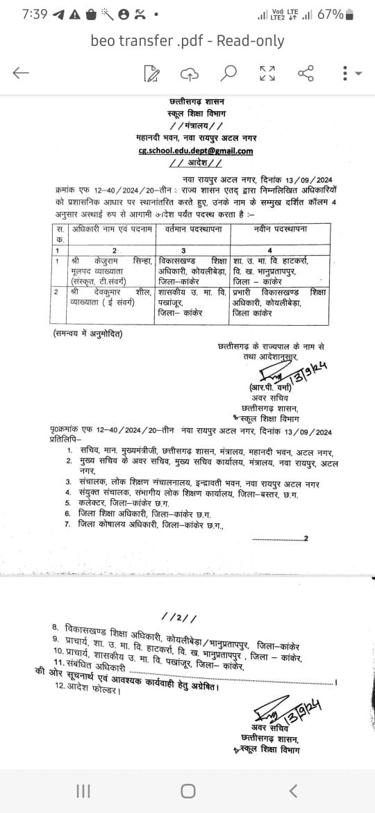 छोटे कापसी :- विवादों में घिरे रहे कोयलीबेड़ा बीईओ केजुराम सिन्हा को प्रभाव से हटा दिया गया है। उनके स्थान पर देव कुमार शील व्याख्याता पखांजूर शा.उ.मा.वि को कार्यभार सौंपा गया है।