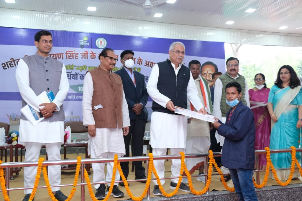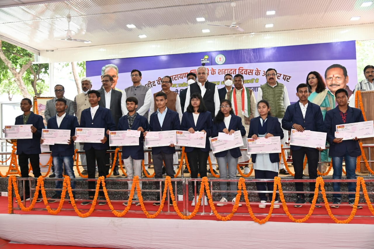 रायपुर :- मुख्यमंत्री भूपेश बघेल ने कहा है कि छत्तीसगढ़ के बच्चों में प्रतिभा की कमी नहीं है, जरूरत सिर्फ उनकी प्रतिभा को तराशने और उन्हें अच्छे अवसर प्रदान करने की है। मुख्यमंत्री आज महान स्वतंत्रता संग्राम सेनानी अमर शहीद वीर नारायण सिंह के शहादत दिवस पर अपने निवास कार्यालय में आयोजित स्वर्गीय राजीव गांधी बाल भविष्य सुरक्षा प्रयास आवासीय विद्यालय के प्रतिभावान विद्यार्थियों के प्रतिभा सम्मान समारोह को सम्बोधित कर रहे थे। मुख्यमंत्री ने कार्यक्रम के प्रारम्भ में शहीद वीर नारायण सिंह के चित्र पर माल्यार्पण कर उन्हें विनम्र श्रद्धांजलि अर्पित की। समारोह में अनुसूचित जाति एवं जनजाति विकास मंत्री डॉ.प्रेमसाय सिंह टेकाम, उद्योग मंत्री कवासी लखमा, संसदीय सचिव द्वारिकाधीश यादव, विधायक देवेंद्र यादव, आदिम जाति कल्याण विभाग के सचिव डी.डी.सिंह, आयुक्त शम्मी आबिदी उपस्थित थीं।