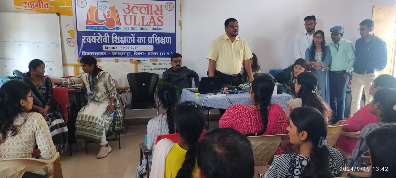 जगदलपुर। उल्लास नवभारत साक्षरता कार्यक्रम के अंतर्गत विकासखंड स्त्रोत समन्वयक कार्यालय जगदलपुर में विकासखंड स्तरीय स्वयंसेवी शिक्षकों के प्रशिक्षण का आयोजन किया गया।