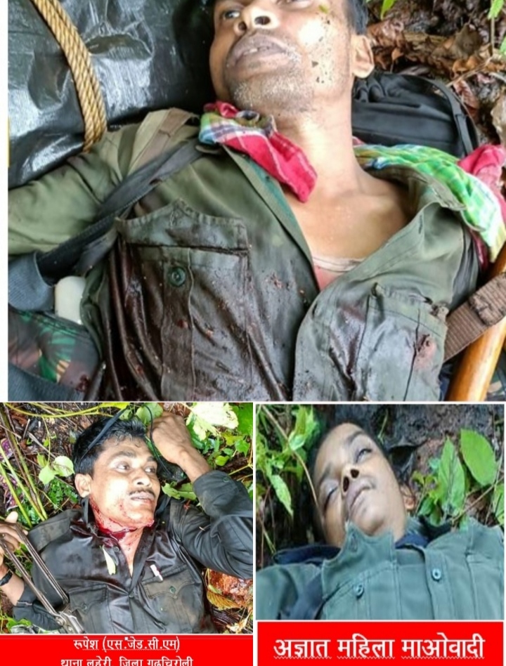 जगदलपुर।बस्तर संभाग के अबूझमाड़ क्षेत्र में पुलिस और सुरक्षा बलों ने टॉप नक्सली कमांडर रुपेश और शीर्ष नक्सली लीडर जगदीश को मार गिराया है। एक महिला नक्सली के शव की शिनाख्त नहीं हो पाई है।मुठभेड़ के बाद तीनों के शव बरामद कर लिए गए हैं। वहीं मुठभेड़ स्थल से एके-47, इंसास, एसएलआर जैसे घातक आधुनिक हथियार मिले हैं। माना जा रहा है कि इस मुठभेड़ में कुछ और नक्सली मारे गए हैं तथा कई घायल हुए हैं, जिन्हें नक्सली अपने साथ ले गए हैं।