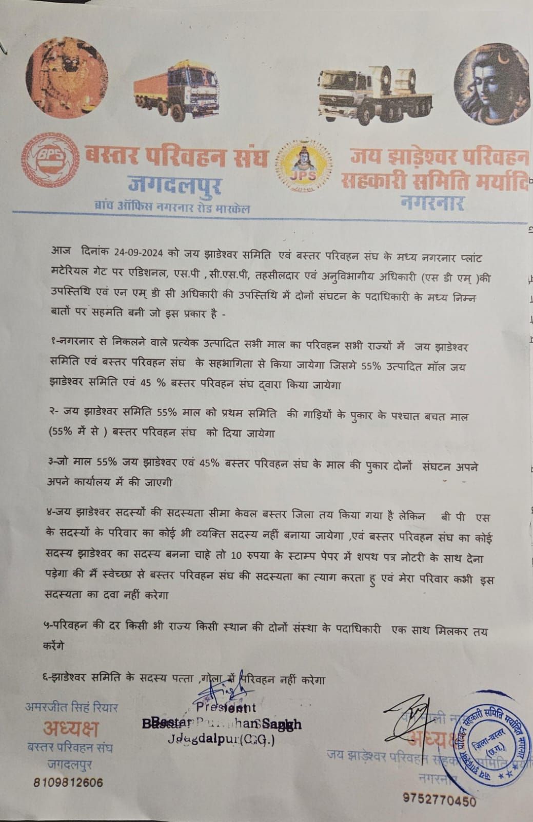 बस्तर परिवहन संघ अध्यक्ष अमरजीत सिंह रियार और जय झाड़ेश्वर परिवहन समिति के अध्यक्ष बनमाली नाग ने संयुक्त बयान जारी किया है।बयान में कहा गया है कि जय झाड़ेश्वर समिति एवं बस्तर परिवहन संघ के मध्य नगरनार प्लांट मटेरियल गेट पर एडिशनल एसपी, सीएसपी, एसडीएम एवं तहसीलदार और एनएमडीसी अधिकारी की उपस्थिति में दोनों संगठनों के पदाधिकारियों के मध्य सकारात्मक बातें हुईं।