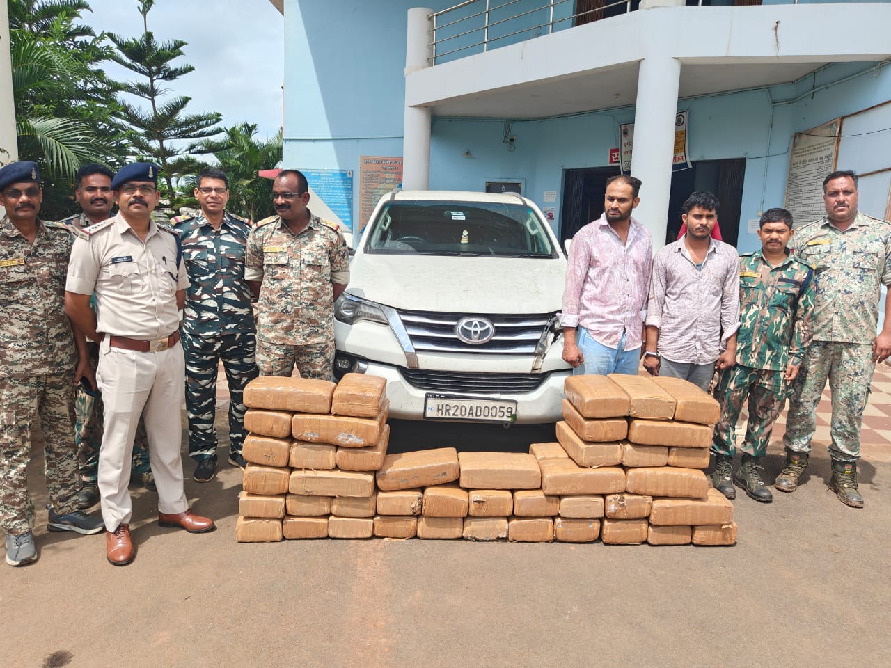 बस्तर के रास्ते सरहदी राज्य ओड़िशा से विभिन्न राज्यों तथा छत्तीसगढ़ के मैदानी जिलों में बड़े पैमाने पर गांजा की तस्करी होती है। ओड़िशा से छत्तीसगढ़ राज्य की ओर होने वाले गांजा के परिवहन पर अंकुश लगाने पुलिस अधीक्षक शलभ कुमार सिन्हा अतिरिक्त पुलिस अधीक्षक माहेश्वर नाग के दिशा निर्देशन एवं नगर पुलिस अधीक्षक महोदय उदित पुष्कर के पर्यवेक्षण में थाना प्रभारी निरीक्षक टामेश्वर चौहान के नेतृत्व में थाना स्तर पर गठित टीम ने 26 सितंबर को मुखबिर से मिली सूचना के आधार पर ग्राम माचकोट चौक के पास नाकाबंदी कर एक सफेद रंग की फारच्यूनर कार एचआर 20 एडी 0059 को जिसे रोका। कार चालक नवीन कुमार सैमी पिता सेतसिंग सैमी जाति बैरागी उम्र 28 वर्ष निवासी ग्राम जामनी तहसील सफीतो थाना पीलू बेड़ा जिला जींद हरियाणा एवं योगेश कुमार पुनिया पिता मामन सिंह पुनिया जाति जाट उम्र 26 वर्ष साकिन ग्राम सिंधवी खेरा तहसील थाना जींद हरियाणा को हिरासत में लिया। तलाशी लेने पर कार से 48 पैकेटों में भरा 251 किलो 500 ग्राम गांजा बरामद हुआ। इस गांजे की कीमत 25 लाख 15 हजार रूपए बताई गई है। गांजा, परिवहन में प्रयुक्त कार,एक मोबाईल फोन को जप्त कर लिया गया है। बरामद माल की कुल कीमत 45 लाख 16 हजार 500 रुपए आंकी गई है। दोनों आरोपियों के खिलाफ का धारा 20 (ख) i (ग) एनडीपीएस एक्ट दर्ज कर विवेचना में लिया गया। आरोपी को न्यायिक रिमांड पर न्यायालय के समक्ष पेश किया गया। इस मामले को पकड़ने में निरीक्षक टामेश्वर चौहान, सहायक उप निरीक्षक जदुराम बघेल, प्रधान आरक्षक विकास सिंह, विनोद यादव आरक्षक चेतन बघेल, चंद्रकुमार कंवर, राजेश कश्यप, डीएसएफ आरक्षक मनोज कश्यप, कार्तिक नाग, भास्कर भारद्वाज, सैनिक जगन्नाथ नाग का विशेष योगदान रहा है।