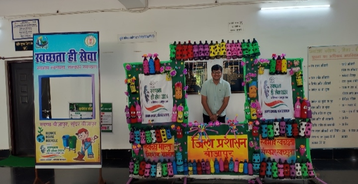 बीजापुर :- स्वच्छता ही सेवा अभियान अंतर्गत इस बार का थीम अनुसार “वेस्ट से बेस्ट” का भी आयोजन किया गया। कलेक्टर संबित मिश्रा ने बताया कि प्लास्टिक हमारे पर्यावरण के लिए बहुत ही घातक है, जिले के ग्रामीण क्षेत्रों में इस बार भारत सरकार से प्राप्त थीम अनुसार क्लीनलेस टारगेट यूनिट (ब्लैक स्पॉट) का चिन्हांकन कर उसकी श्रमदान से सफाई कर उस जगह को संरक्षित किया गया साथ ही लोगों को सिंगल यूज प्लास्टिक का कम से कम उपयोग हेतु जागरूक भी करना है कि प्लास्टिक या किसी भी प्रकार के कचरे को इधर उधर न फेंके उन्होंने बताया कि हमें रिड्यूज, रियूज एवं रिसाईकल के सिद्धांत पर आधारित कार्य करना चाहिए, जितना हो सके प्लास्टिक का उपयोग कम करे, प्लास्टिक का पुनः उपयोग कर कुछ अन्य चीजें बना सकते है तथा पुनर्चक्रण कर जलवायु परिवर्तन से निपटने में मदद होगी। मुख्य कार्यपालन अधिकारी जिला पंचायत हेमंत रमेश नंदनवार के मार्गदर्शन में प्लास्टिक के फेंके गए पानी बोतल को एकत्रित कर सेल्फी स्टैंड का निर्माण किया गया। जिससे लोगों में वेस्ट से बेस्ट बनाने की लालसा उत्पन्न हो। पालस्टिक की बोतलों से बनाया गया सेल्फी स्टैंड आकर्षण का केंद्र रहा।