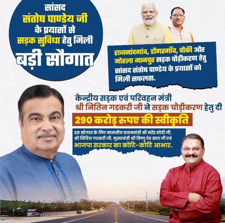 राजनांदगांव से मानपुर सड़क राजनांदगांव की अति महत्वपूर्ण सड़क है। यह सड़क छत्तीसगढ़ को महाराष्ट्र के गढ़चिरौली जिले को जोड़ती है। इसके अलावा व्यवसायिक दृष्टिकोण से भी यह सड़क बहुत मायने रखती है। यह सड़क दो जिलों राजनांदगांव और मोहला मानपुर, चौकी को जोड़ने का काम करती है।इस मार्ग पर अर्जुनी, डोंगरगांव, कुमर्दा, बांधाबाजार, अंबागढ़ चौकी, चिल्हाटी, कौड़ीकसा, मोहला, मानपुर जैसे बड़े गांव, कस्बे एवं व्यापारिक केंद्र स्थित हैं। डोंगरगांव से लगे बड़े गांव राजा खुज्जी की निर्भरता भी इस सड़क पर है। इन तमाम गांव, कस्बों और शहरों का सबसे बड़ा व्यापारिक केंद्र राजनांदगांव है। इस सड़क पर चौबीसों घंटे छोटे बड़े वाहनों की आवाजाही लगी रहती है। इस लिहाज से इस सड़क को और भी मजबूत एवं व्यवस्थित बनवाने के लिए सांसद संतोष पांडेय लगातार प्रयास करते रहे हैं। वे इस मुद्दे को लेकर छत्तीसगढ़ के मुख्यमंत्री विष्णु देव साय और केंद्रीय सड़क परिवहन मंत्री नितिन गडकरी से भी मिले थे। मुख्यमंत्री विष्णु देव साय भी इसके लिए प्रयासरत रहे हैं। अब इसका सुपरिणाम सामने आया है। केंद्रीय सड़क परिवहन मंत्री नितिन गडकरी के साथ मुख्यमंत्री साय और सांसद संतोष पाण्डेय बैठक राजनांदगांव से मानपुर तक लगभग 100 किलोमीटर लंबी इस सड़क के फोरलेन एक्सप्रेस वे के रूप में तब्दील करने के लिए केंद्रीय भूतल परिवहन मंत्रालय ने 290 करोड़ रुपए की स्वीकृति देकर क्षेत्र को बड़ी सौगात दी है। सड़क के बन जाने के बाद 100 किलोमीटर की यह दूरी की यात्रा अब बड़ी आरामदायक हो जाएगी और सफर भी बहुत ही कम समय में तय हो जाएगा। इससे ईंधन, धन और समय की बड़ी बचत होगी। सांसद संतोष पांडे की पहल के चलते राजनांदगांव संसदीय क्षेत्र को मिली इस बड़ी सौगात से क्षेत्र में खुशी का माहौल है। इस सौगात के लिए भाजपा प्रदेश महामंत्री भरत वर्मा, पूर्व विधायक रामजी भारती, भाजपा जिला अध्यक्ष रमेश पटेल, वरिष्ठ नेता दिनेश गांधी, जिला पंचायत अध्यक्ष, गीता घासी साहू, अंबागढ़ चौकी के पूर्व विधायक संजीव शाह, मदन साहू, नम्रता सिंह, डोंगरगांव के भाजपा नेता रामकुमार गुप्ता, लक्ष्मी नारायण गुप्ता, गुलशन हिरवानी, खुज्जी के भाजयुमो नेता कैलाश शर्मा, तखत सोनकर, संतराम देवांगन, चौकी के भाजपा नेता गुलाब गोस्वामी, राजेश सिंघी, आशीष द्विवेदी, गौरव शर्मा, दिनेश साहू, नम्रता सिंह, मदन साहू , राजू टांडिया, विजय जैन, देवकी नेताम सहित सभी वरिष्ठ भाजपा नेताओं, डोंगरगांव, खुज्जी, कुमर्दा, बांधा बाजार, अंबागढ़ चौकी, चिल्हाटी, कौड़ीकसा, मोहला, गोटाटोला, मानपुर के भाजपा कार्यकर्ताओं और नागरिकों ने केंद्रीय मंत्री नितिन गडकरी, मुख्यमंत्री विष्णुदेव साय और सांसद संतोष पांडे का आभार व्यक्त किय