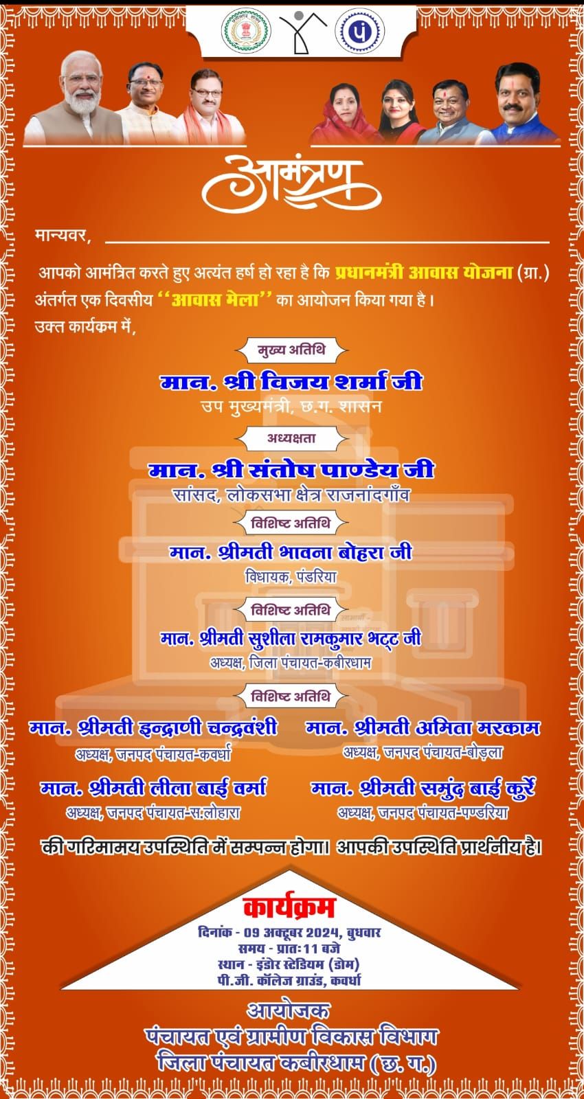 प्रधानमंत्री आवास मेला में मुख्य अतिथि के तौर पर प्रदेश के उपमुख्यमंत्री श्री विजय शर्मा शामिल होंगे। कार्यक्रम की अध्यक्षता क्षेत्रीय सांसद श्री संतोष पांडेय करेंगे। विशिष्ट अतिथि के रूप में पंडरिया विधायक श्रीमती भवना बोहरा, जिला पंचायत अध्यक्ष श्रीमती सुशीला रामकुमार भट्,जनपद अध्यक्ष श्रीमती इन्द्राणी दिनेश चन्द्रवंशी, श्रीमती अमिता मरकाम, श्रीमती लीला बाई वर्मा, श्रीमती समुंद बाई कुर्रे सहित अन्य जनप्रतिनिधि शामिल होंगे।