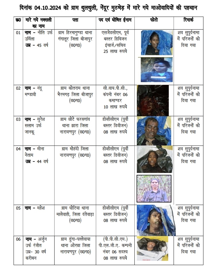 अबूझमाड़ इलाके में नक्सलियों के पूर्वी बस्तर व अबूझमाड़ डिवीजन के नक्सलियों के साथ हुई मुठभेड़ में मारे गए नक्सलियों की संख्या बढ़कर 34 होने के पुख्ता इनपुट पुलिस को मिले हैं। खबर है कि मुठभेड़ के दौरान घायल कुछ नक्सली किसी तरह बचकर भाग निकलने में कामयाब रहे, लेकिन उचित इलाज के अभाव में कम से कम 3 नक्सलियों की मौत होने की जानकारी पुलिस को मिली है। इन तीनों नक्सलियों के शवों का दाह संस्कार उनके नक्सलियों द्वारा जंगल में किए जाने की खबर है। पुलिस इसकी तस्दीक करने में जुटी है। मौके पर मौजूद मोस्ट वांटेड डीवीसीएम नक्सली कमलेश के भी जख्मी होेकर भाग निकलने की खबर आ रही है। मुठभेड़ स्थल से पुलिस ने 31 शव बरामद किए थे, जिनमें 13 महिला व 18 पुरूष नक्सली शामिल थे। इन मृतकों में अब तक कुल 29 नक्सलियों की शिनाख्त हो चुकी है, 2 की शिनाख्त अब तक नहीं हुई है। जिन नक्सलियों की शिनाख्त हो चुकी है, उन पर घोषित कुल ईनामी राशि 2 करोड़ 15 लाख तक पहुंच चुकी है। बस्तर रेंज के पुलिस महानिरीक्षक सुंदरराज पी. ने बताया कि मुठभेड में 1 डीकेएसजेडसी, 1 सीवायपीसी कमांडर, 3 डीवीसीएम, 14 पीएलजीए कंपनी नंबर 6 के सदस्य, 2 डीकेएसजेडसी गार्ड, 6 एरिया कमेटी सदस्य व 2 एरिया कमेटी के पार्टी सदस्य कैडर की पहचान की जा चुकी है। उप पुलिस महानिरीक्षक दंतेवाड़ा कमलोचन कश्यप ने बताया कि शेष 2 नक्सलियों की शिनाख्त के प्रयास जारी हैं। पुलिस अधीक्षक दंतेवाड़ा गौरव राय व पुलिस अधीक्षक नारायणपुर प्रभात कुमार ने बताया कि जिन 29 नक्सलियों की शिनाख्त हो चुकी है उनमें नीति उर्फ उर्मिला एसजेडसीएम पूर्व बस्तर डिवीजन इंचार्ज सचिव 25 लाख ईनामी, निवासी ग्राम हिरमागुंडा, जिला बीजापुर, नंदू मंडावी सीवायपीसी कंपनी नंबर 6 कमांडर 10 लाख ईनामी, निवासी ग्राम कोतराम, जिला बीजापुर, सुरेश सलाम उर्फ जानकू डीवीसीएम आमदई एरिया कमेटी 8 लाख ईनामी निवासी ग्राम छोटे फरसगांव, जिला नारायणपुर, मीना नेताम, डीवीसीएम, 8 लाख ईनामी निवासी ग्राम मोहंदी जिला नारायणपुर, महेश डीवीसीएम 8 लाख ईनामी, निवासी ग्राम घोटिया थाना मालेवाही, जिला दंतेवाड़ा, अर्जुन उर्फ रंजीत, पीएलजीए कंपनी नंबर 6 सदस्य 8 लाख ईनामी ग्राम डुंगा-पल्लेवाया, जिला नारायणपुर, सुंदर उर्फ कमलू पीएलजीए पीपीसीएम कंपनी नंबर 6 सदस्य 8 लाख ईनामी ग्राम मदूम जिला बीजापुर, बुधराम मड़काम, पीपीसीएम पीएलजीए कंपनी नंबर 6 सदस्य 8 लाख ईनामी निवासी जिला बीजापुर, मोहन मंडावी, पीपीसीएम पीएलजीए 6 सदस्य ईनामी 8 लाख निवासी ग्राम बोदली थाना मालेवाही, बसंती पति साकेत, पीएलजीए कंपनी नंबर 6 सदस्या ईनामी 8 लाख निवासी कोयलीबेड़ा कांकेर, जगनी कोर्राम कंपनी नंबर 6 सदस्या ईनामी 8 लाख निवासी अडेंगपाल थाना बैंगलूर जिला नारायणपुर, अनिल पार्टी सदस्य पीए