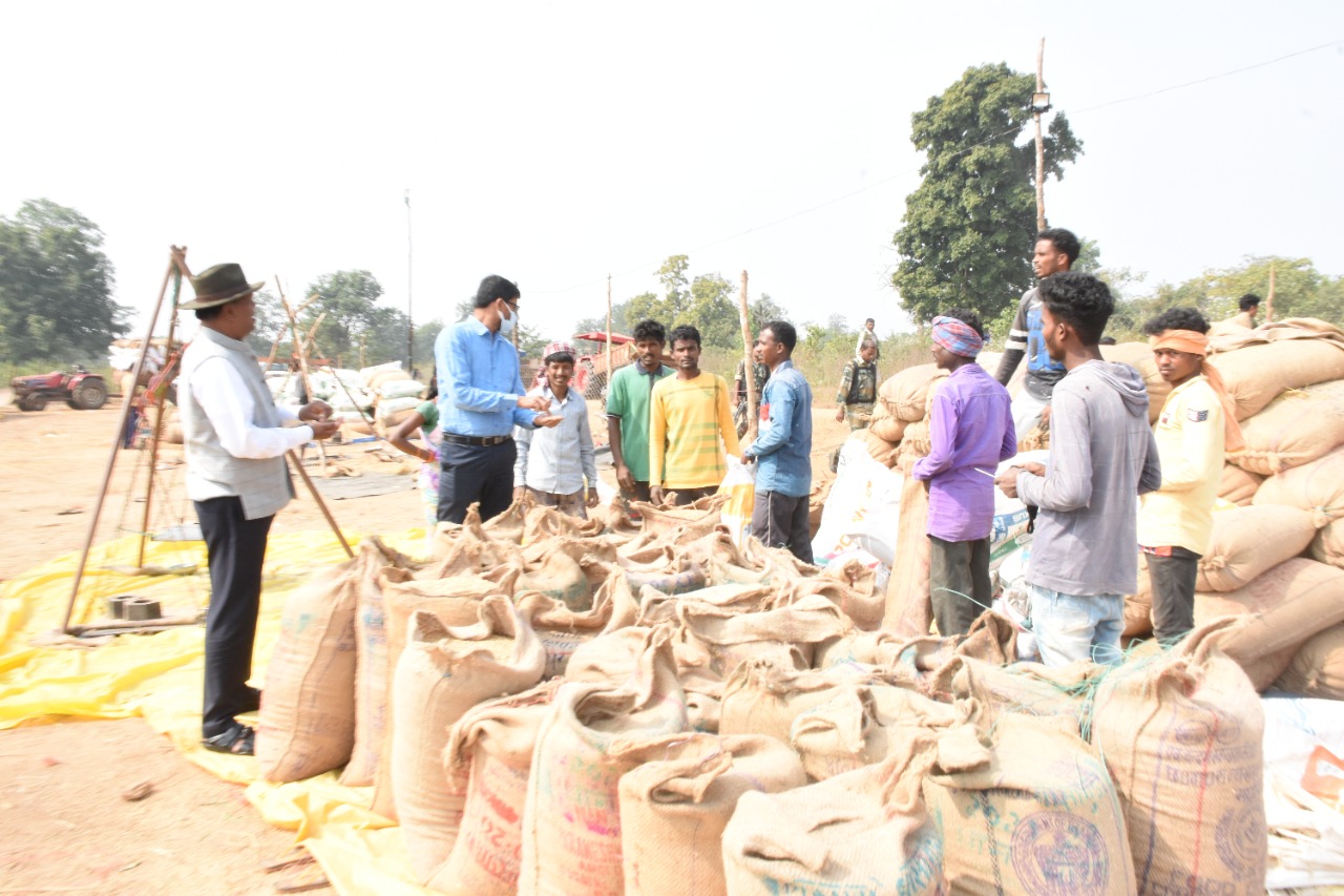 बीजापुर :- कलेक्टर राजेन्द्र कुमार कटारा एवं पुलिस अधीक्षक कमलोचन कश्यप ने उसूर ब्लाक अंतर्गत बासागुडा एवं उसूर धान उपार्जन केन्द्र का जायजा लिया इस दौरान धान खरीदी की सभी व्यवस्थाओं की जानकारी ली। किसानों को सभी सुविधाएं उपलब्ध कराने के निर्देश दिए। अनावश्यक रुप से किसानों परेशानी का सामना न करे इसके लिए विशेष ध्यान देने को कहा। कलेक्टर कटारा ने किसानों को जारी टोकन, उपलब्ध बारदाने की स्थिति, आज तक किये धान की खरीदी, नमी मापक यंत्र, हमाल, तौल मशीन उपार्जन केन्द्र में उपलब्ध तिरपाल, धान की समुचित रख-रखाव, धान की स्टैकिंग एवं डनेज इत्यादि के बारे में जानकारी लेकर समिति प्रबंधक को आवश्यक दिशा निर्देश दिए। केन्द्र में स्वच्छ पेयजल, बिजली, कम्प्यूटर के बारे में जानकारी लिया। वहीं कोविड टीकाकरण के लिए किसानों में जागरुकता लाकर टीकाकरण के लिए प्रेरित कर किसानों को टीकाकरण कराने के निर्देश दिए।