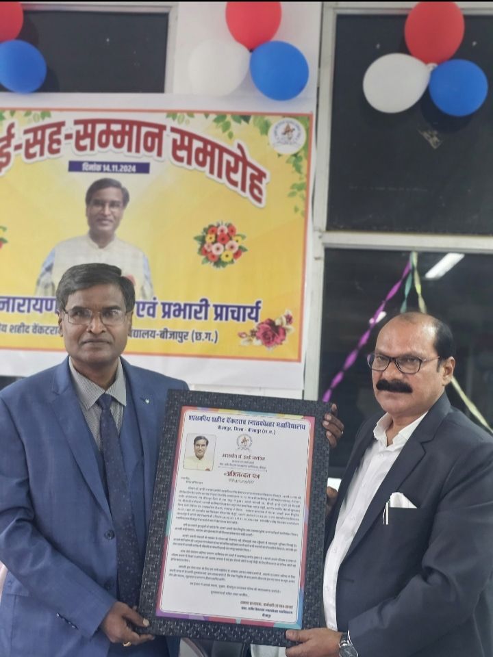 बीजापुर :- शहीद वेंकट राव महाविद्यालय के प्राचार्य डॉ. नारायण झाड़ी को सेवा निवृत्ति के पश्चात महाविद्यालय परिसर में आत्मीय विदाई दी गई। इस दौरान डॉ. झाड़ी सपत्नीक पहुंचे थे डॉ. नारायण झाड़ी मूल रूप से बीजापुर जिले के उसूर ब्लॉक के निवासी हैं जिन्होने अपने शिक्षा दीक्षा और बीजापुर के कठिन परिस्थितियों के बावजूद अपनी पढ़ाई पूरी कर प्राचार्य के पद पर पहूंचे उन्होने अपना अनुभव साझा किया।