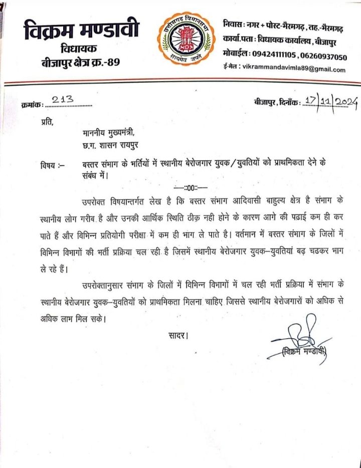 मुख्यमंत्री को सौंपे गए ज्ञापन में विधायक विक्रम मंडावी ने कहा कि बस्तर संभाग आदिवासी बाहुल्य क्षेत्र है संभाग के स्थानीय लोग गरीब है और उनकी आर्थिक स्थिति ठीक नही होने के कारण आगे की पढ़ाई कम ही कर पाते हैं और विभिन्न प्रतियोगी परीक्षा में कम ही भाग ले पाते है। वर्तमान में बस्तर संभाग के जिलों में विभिन्न विभागों की भर्ती प्रक्रिया चल रही है जिसमें स्थानीय बेरोजगार युवक-युवतियां बढ़ चढकर भाग ले रहे हैं। बस्तर संभाग के जिलों में विभिन्न विभागों में चल रही भर्ती प्रक्रिया में संभाग के स्थानीय बेरोजगार युवक-युवतियों को प्राथमिकता मिलना चाहिए जिससे स्थानीय बेरोजगारों को अधिक से अधिक लाभ मिल सके।