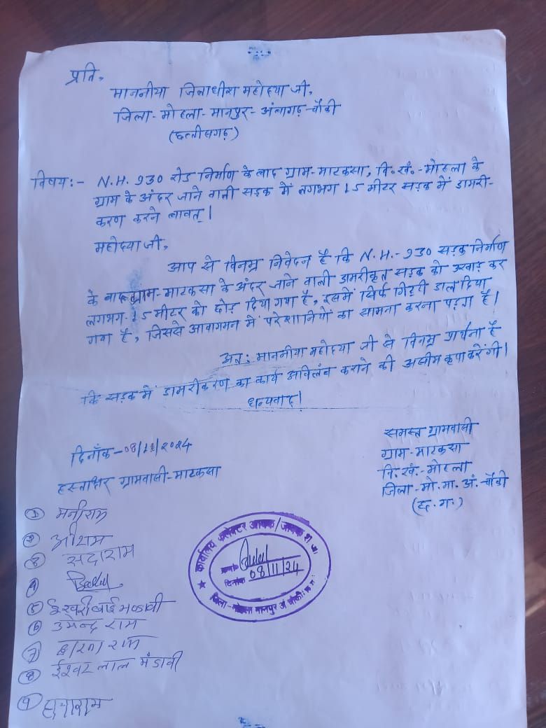 सड़क डामरीकरण की मांग को लेकर माटकसा के ग्रामीणों ने कलेक्टर को सौंपा ज्ञापन