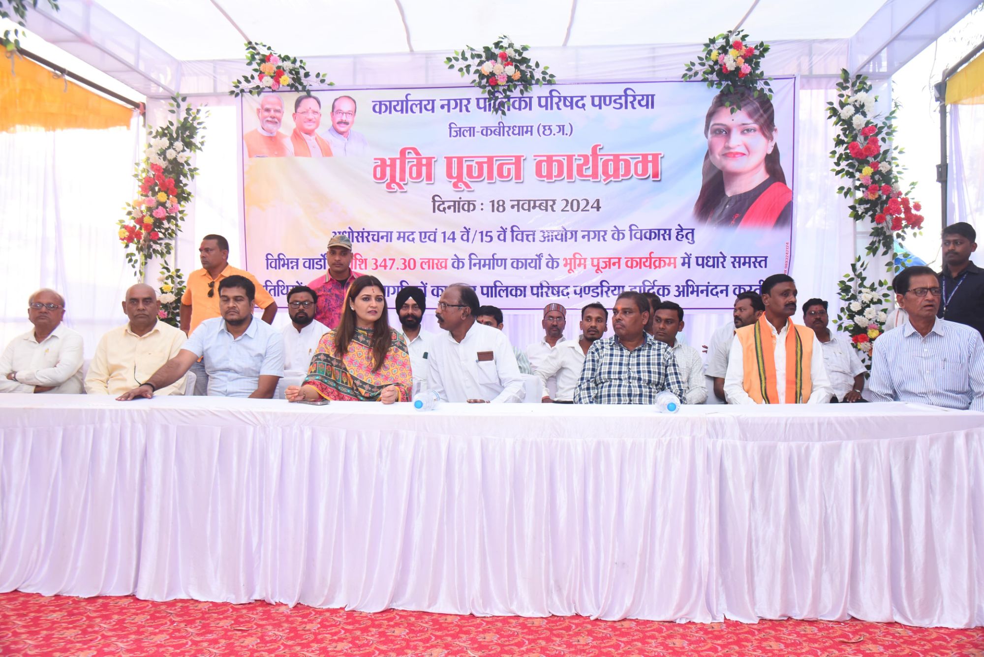 कवर्धा :- पंडरिया विधानसभा में अधोसंरचना विकास एवं जनता की सुविधाओं के लिए पंडरिया विधायक श्रीमती भावना बोहरा द्वारा लगातार सार्थक प्रयास किए जा रहें हैं। सौन्दर्यीकरण से लेकर जनता की सुविधाओं के लिए सड़क, नाली,पुल-पुलिया निर्माण के साथ ही व्यवसायिक गतिविधियों को बढ़ावा देने के लिए अधोसंरचना विकास के लिए आज सामुदायिक भवन पंडरिया में विधायक भावना बोहरा ने करोड़ों के निर्माण कार्यों का भूमिपूजन किया। जिसके अंतर्गत अधोसंरचना मद, मंडी बोर्ड एवं 14वें/15वें वित्त आयोग मद के तहत कुल 4 करोड़ 31 लाख 62 हजार रुपए के विकास कार्यों का भूमिपूजन व लोकार्पण किया गया।