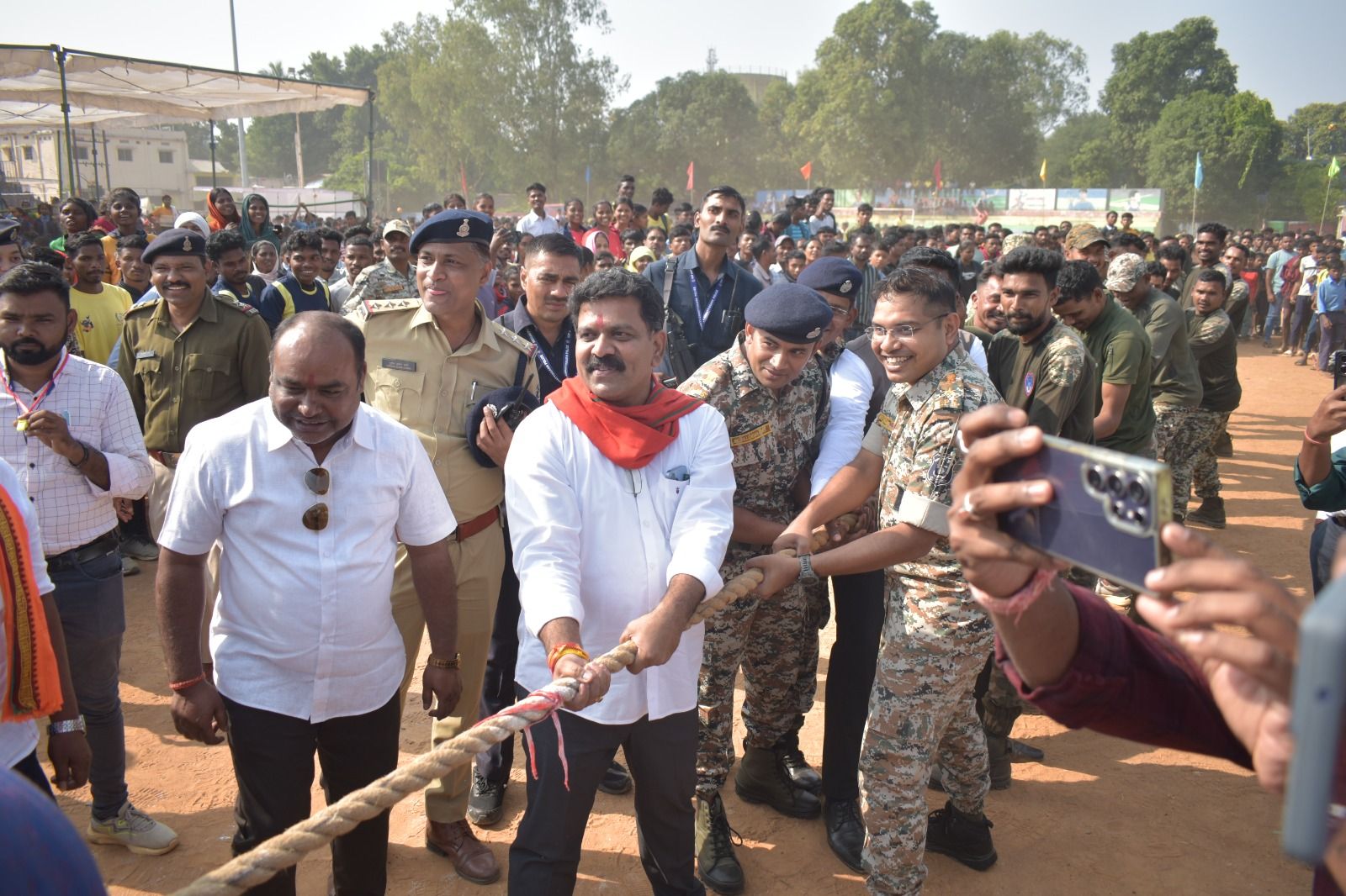 इस अवसर पर उप मुख्यमंत्री विजय शर्मा एवं खेल मंत्री टंकराम वर्मा खिलाड़ियों के उत्साह को देख प्रफुल्लित नजर आए और भव्य आयोजन को देख युवाओं में नया जोश भरा उनके साथ सेल्फी एवं फोटो सेशन कराया। बस्तर ओलंपिक प्रतियोगिता के आयोजन के दौरान कस्तूरबा गांधी बालिक विद्यालय, बीजापुर स्पोर्ट्स एकेडमी एवं कन्या शिक्षा परिसर की मनमोहक प्रस्तुति की उप मुख्यमंत्री विजय शर्मा ने जमकर तारीफ की। वहीं रायपुर की टीम द्वारा बीजापुर एवं बस्तर में नक्सलियों की कायराना हरकत से किस प्रकार निर्दाेष ग्रामीणों को पीड़ा और तकलीफ उठानी पड़ रही है उसका जीवंत चित्रण किया गया। इस दौरान उप मुख्यमंत्री विजय शर्मा एवं खेल मंत्री शटंकराम वर्मा द्वारा ध्वजारोहरण कर खेल का शुभारंभ किया गया, खेल भावना से खेलने के शपथ दिलाई गई एवं कबड्डी, व्हालीबाल खेलों का टॉस करके खिलाड़ियों से परिचय प्राप्त कर खेल का शुभारंभ किया गया। गृहमंत्री विजय शर्मा के साथ पुलिस विभाग के अधिकारी एवं राजस्व मंत्री टंकराम वर्मा के साथ जिला प्रशासन के अधिकारियों के बीच रस्साकसी का मुकाबला हुआ, जिसमें पुलिस विभाग विजेता बना।