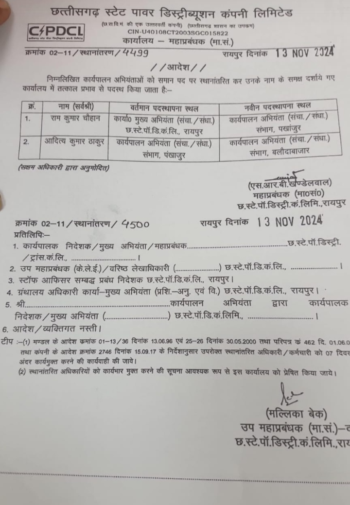 इस संबंध पर प्रबंध निदेशक भीम सिंह कंवर रायपुर ने बताया दो-तीन दिनों में रिलीविंग व जॉइनिंग हो जाएगा आदेश का पालन नहीं करने पर नियमानुसार कार्यवाही किया जाएगा।