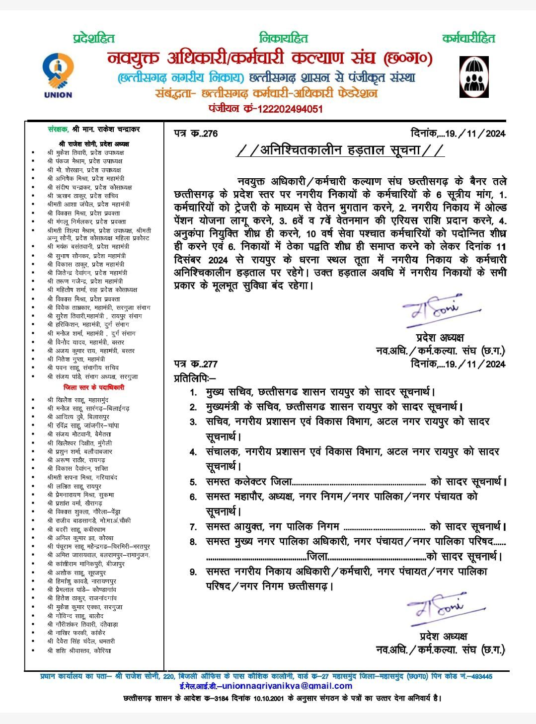 कर्मचारी संघ के जिलाध्यक्ष बद्रीराम साहू ने बताया कि छत्तीसगढ़ प्रदेश नगरीय निकाय अधिकारी कर्मचारी कल्याण संघ से प्राप्त निर्देश के परिपालन एवं नगरीय निकाय की महासंघ बैठक में लिये गये निर्णय अनुसार हड़ताल में सभी अधिकारी-कर्मचारियों ने अपनी मांग को लेकर प्रदर्शन कर रहे है हड़ताल में जाने की सूचना नगर पालिका अध्यक्ष महोदय व मुख्य नगर पालिका अधिकारी को सौंपा दिया है।