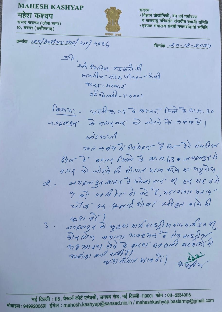 इसके साथ ही सांसद महेश कश्यप ने जगदलपुर से सुकमा राष्ट्रीय राजमार्ग 30 को फोरलेन बनाने की भी मांग केंद्रीय सड़क एवं भूतल परिवहन मंत्री नितिन गडकरी के समक्ष रखी। राष्ट्रीय राजमार्ग 63 को जगदलपुर नगर से जोड़ने की सौगात प्रदान करने का आग्रह श्री कश्यप ने किया। जगदलपुर शहर के प्रवेश द्वार महाराणा प्रताप चौक पर हो रही छोटी बड़ी दुर्घटनाओं का हवाला देते हुए बस्तर सांसद महेश कश्यप ने महाराणा प्रताप चौक पर फ्लाई ओवर निर्माण की स्वीकृति देने का आग्रह केंद्रीय मंत्री श्री गडकरी से किया है। उल्लेखनीय है कि बस्तर लोकसभा क्षेत्र से सांसद चुने जाने के बाद से ही महेश कश्यप बस्तर के विकास और यहां के लोगों को जन सुविधाएं मुहैया कराने के लिए दिन रात एक किए हुए हैं। एक दिन पहले ही उन्होंने केंद्रीय संचार मंत्री ज्योतिरादित्य सिंधिया से भेंट की थी। उन्होंने श्री सिंधिया से बस्तर में मोबइल नेटवर्क कनेक्टीविटी बढ़ाने के लिए लोकसभा क्षेत्र के सभी जिलों के सुदूर गांवों में टॉवर स्थापित कराने, डाक घरों का उन्नयन कराकर पर्याप्त संसाधन और स्टॉफ उपलब्ध कराने की मांग की थी।
