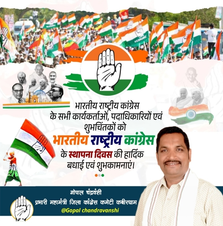 कवर्धा :- स्वतंत्रता संग्राम, रियासतों का एकीकरण, राष्ट्र निर्माण, आर्थिक उदारवाद, हरित क्रांति, श्वेत क्रांति, से लेकर सूचना क्रांति तक देश की हर छोटी-बड़ी उपलब्धियों में अपनी महत्वपूर्ण भूमिका निभाने वाली कांग्रेस का स्थापना दिवस हर भारतीय के लिए एक गौरवपूर्ण दिन है।