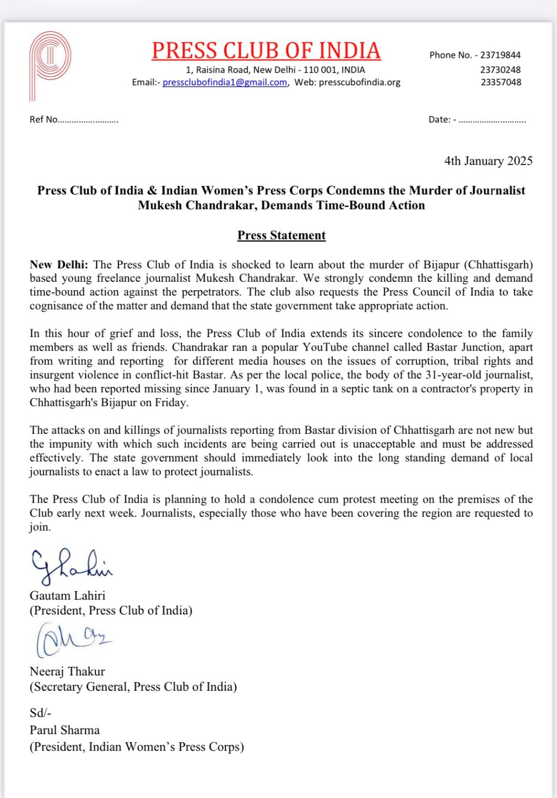 मुकेश चंद्राकर की हत्या पर प्रेस क्लब ऑफ इंडिया ने की कड़ी निंदा